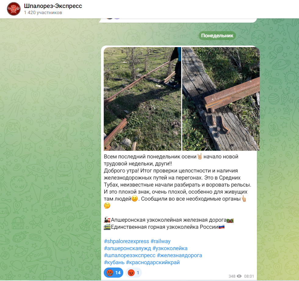 На перегоне Новый Режет (почта) - Тубы (Средние) спёрли рельсы