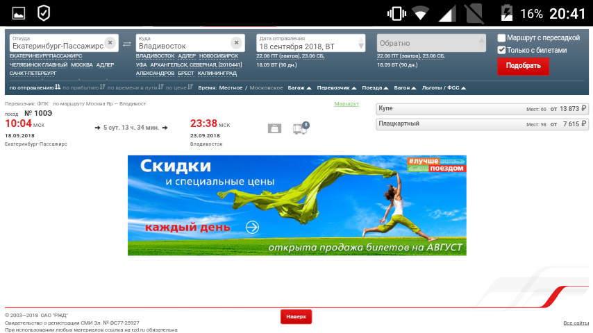 контингент в 100 попроще. Я его тоже зафоткала в апреле. Может позже пост выпущу. Но, там было минут 10-15 на фото, надо еще фотографировать , чтоб посмотреть.Колхозник » 21-06-2018, 19:23:Нина, не знаю, насколько вам важно мое мнение. Однако все равно его выскажу. Мечта на то и мечта, чтобы не просто сбыться, а сделать это еще и красиво. Забудьте про 100-й скотовоз. Извернитесь, но купите билет до Владика на "Россию". Там и контингент поприличнее, и ехать будет комфортнее. Просто поверьте человеку, который тоже немало проехал: и на собаках, и в общаках, и на плацкартах, и в купе, и даже в св. Каждый опыт получен в свое время. Если же поездку будете делить, то 100 подойдет. Если поедете по всему маршруту из ЕКБ, то только единичкаlopik: поеду на 100. Но, может будет акция у ФПК , как в том году
