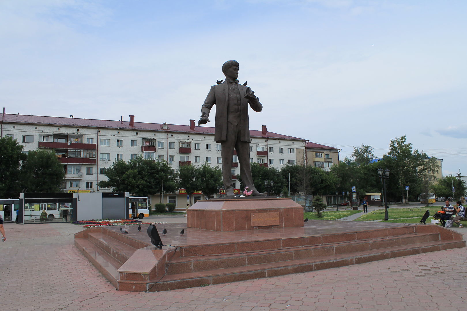Памятник Магжану Жумабаеву на привокзальной площади.