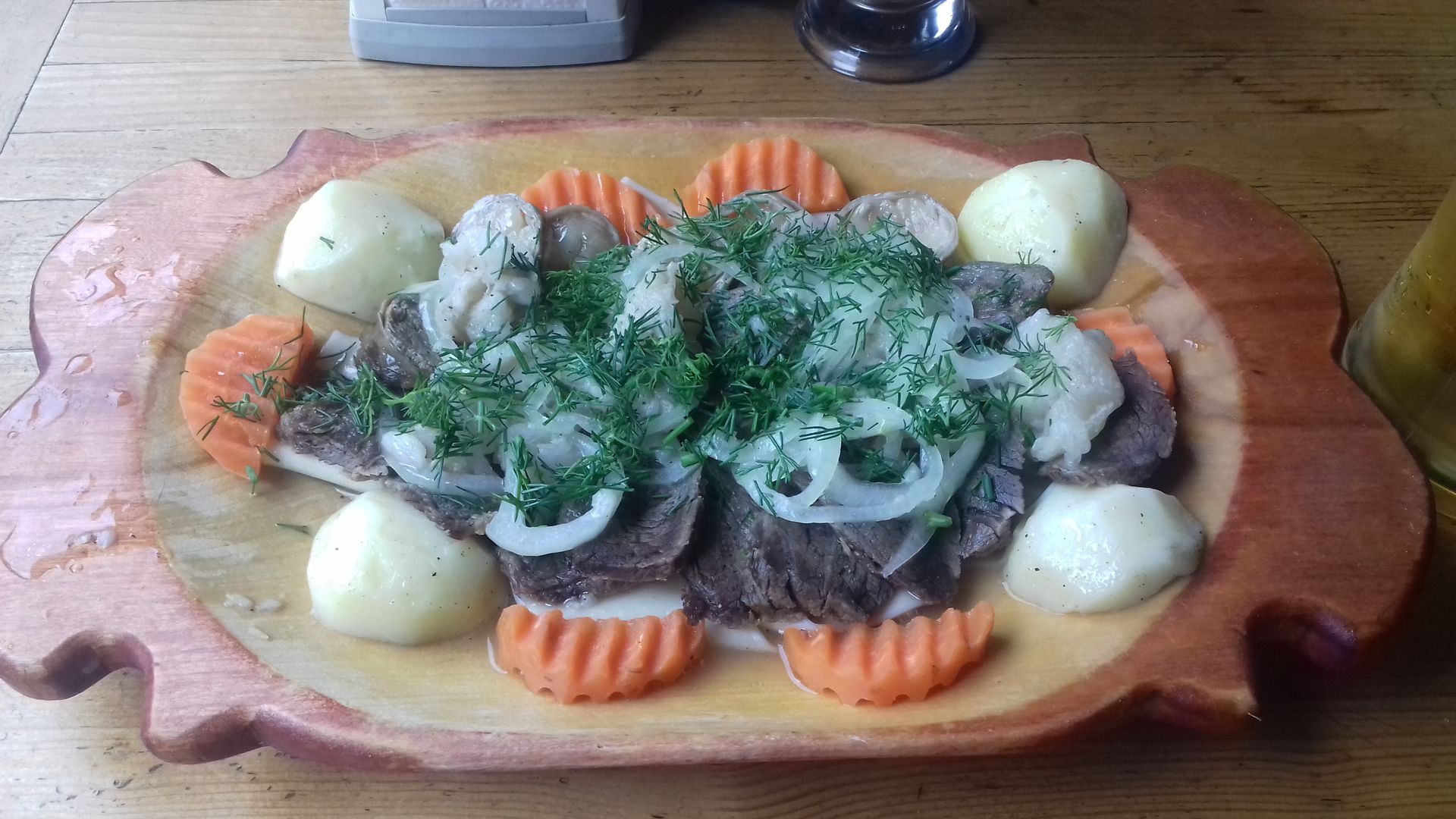 А вот бешбармак шурин сам делал, совсем по другому выглядел. Лапша большими квадратиками, лук и мясо.