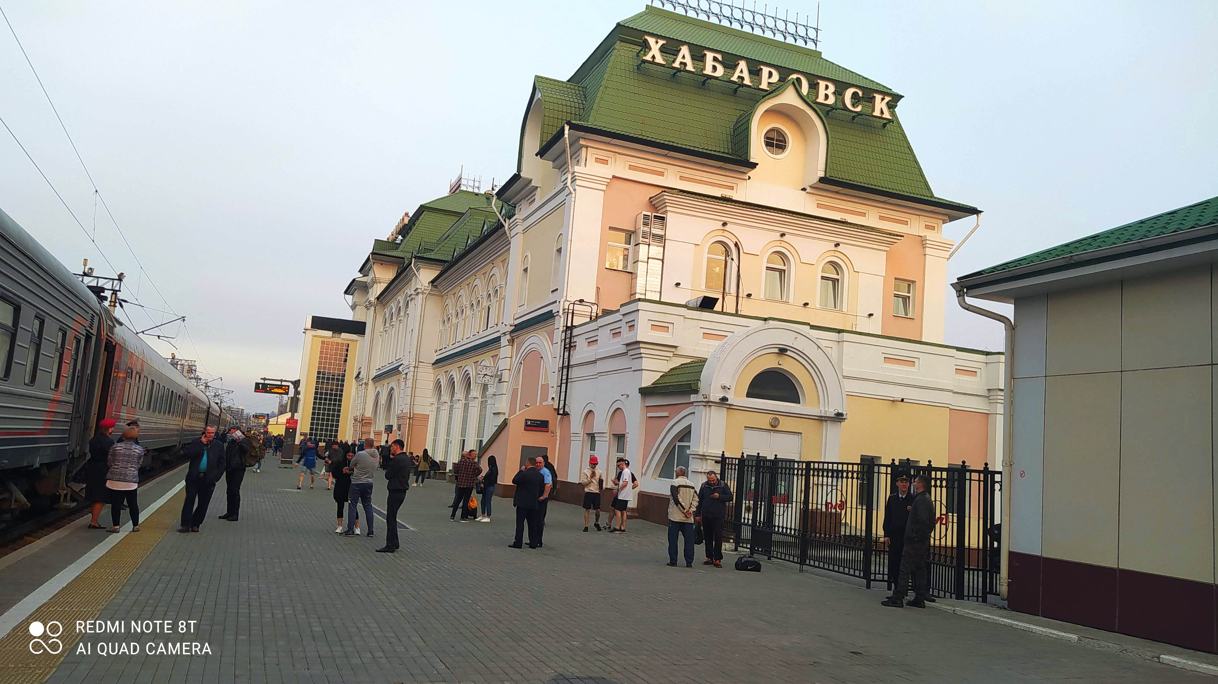 Вот и Хабаровск. Прибыли точно по расписанию на 1-й путь. Большая высадка и ещё больше посадка - в хвост прицепили 6 вагонов: 21К и 22К - старая Тверь, 23К - СМР, 24П и 25П - НМР, и последний багажный. Странно, на сайте 25-го не было видно, но посадка в него идëт. Может недавно добавили...