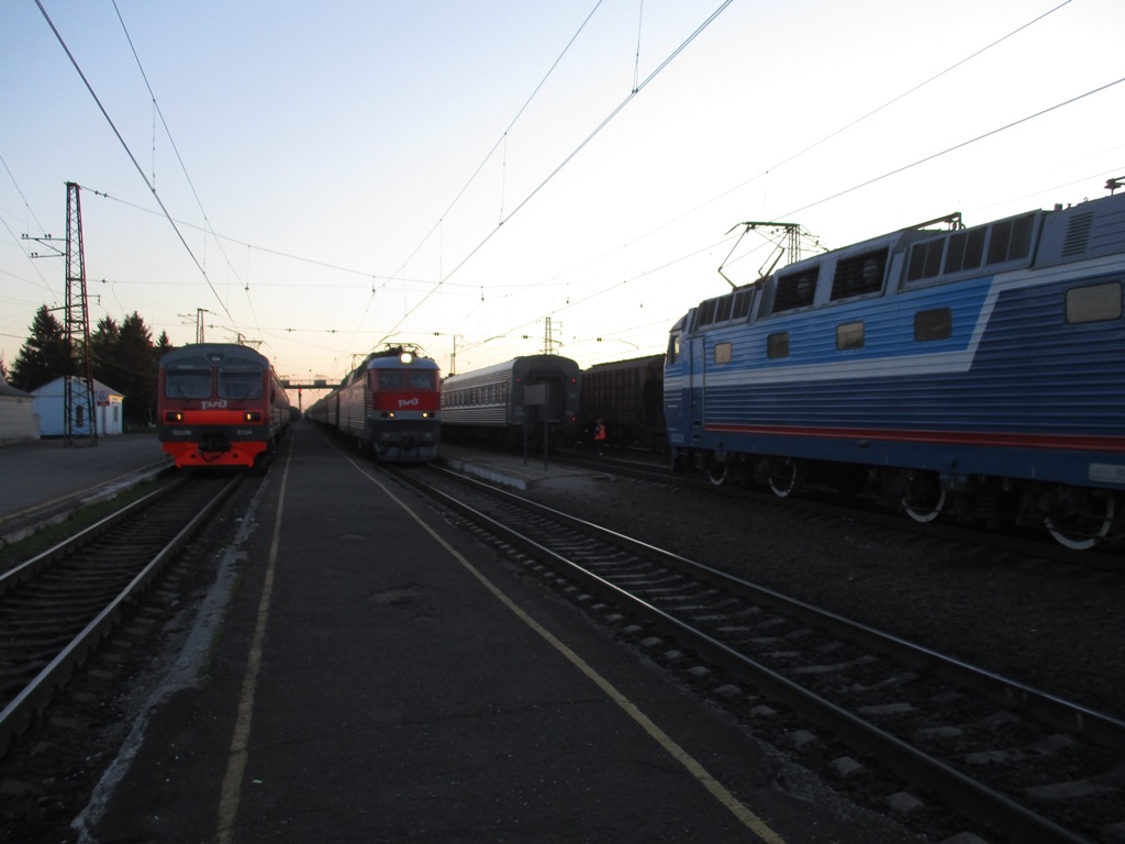 станция Ржава, вид на юг. слева мой электропоезд в сторону Курска, справа - пойдет на Белгород. еще правее мент идет ко мне.