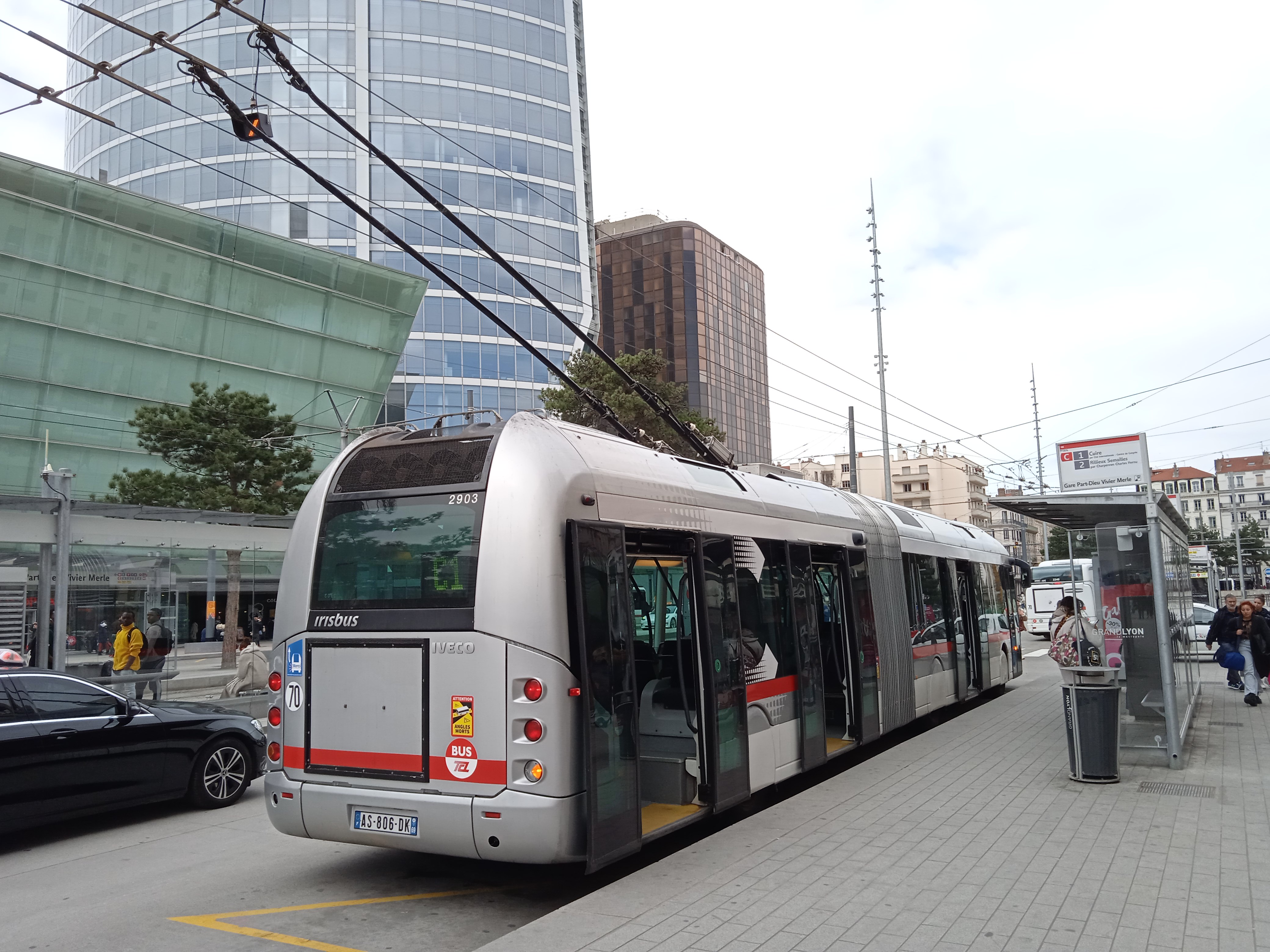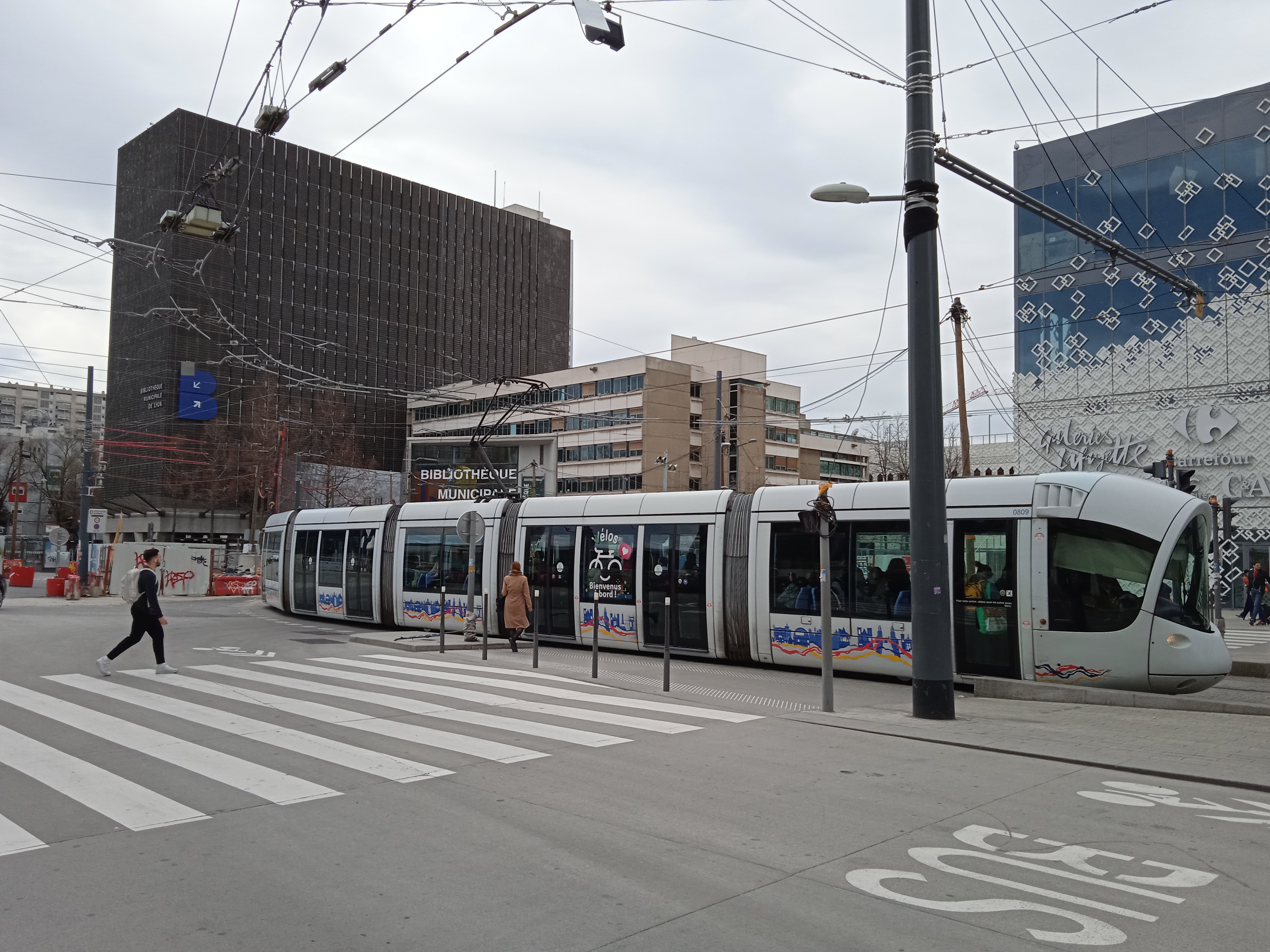 В 20 км к востоку находится транспортный узел Сент-Экзюпери, состоящий из аэропорта и станции на скоростной ЖД линии Париж-Марсель. Головные пути станции платформ не имеют и предназначены для безостановочного проследования станции без снижения скорости. Поезда с остановкой в Сент-Экзюпери принимаются на боковые пути. С городом Сент-Экзюпери связан трамвайной линией Рона Экспресс, по которой курсируют трамваи Штадлер Танго. Линия 22 км, в пути 29 минут. В пределах города трамвай едет по тем же путям, что и городские трамваи.