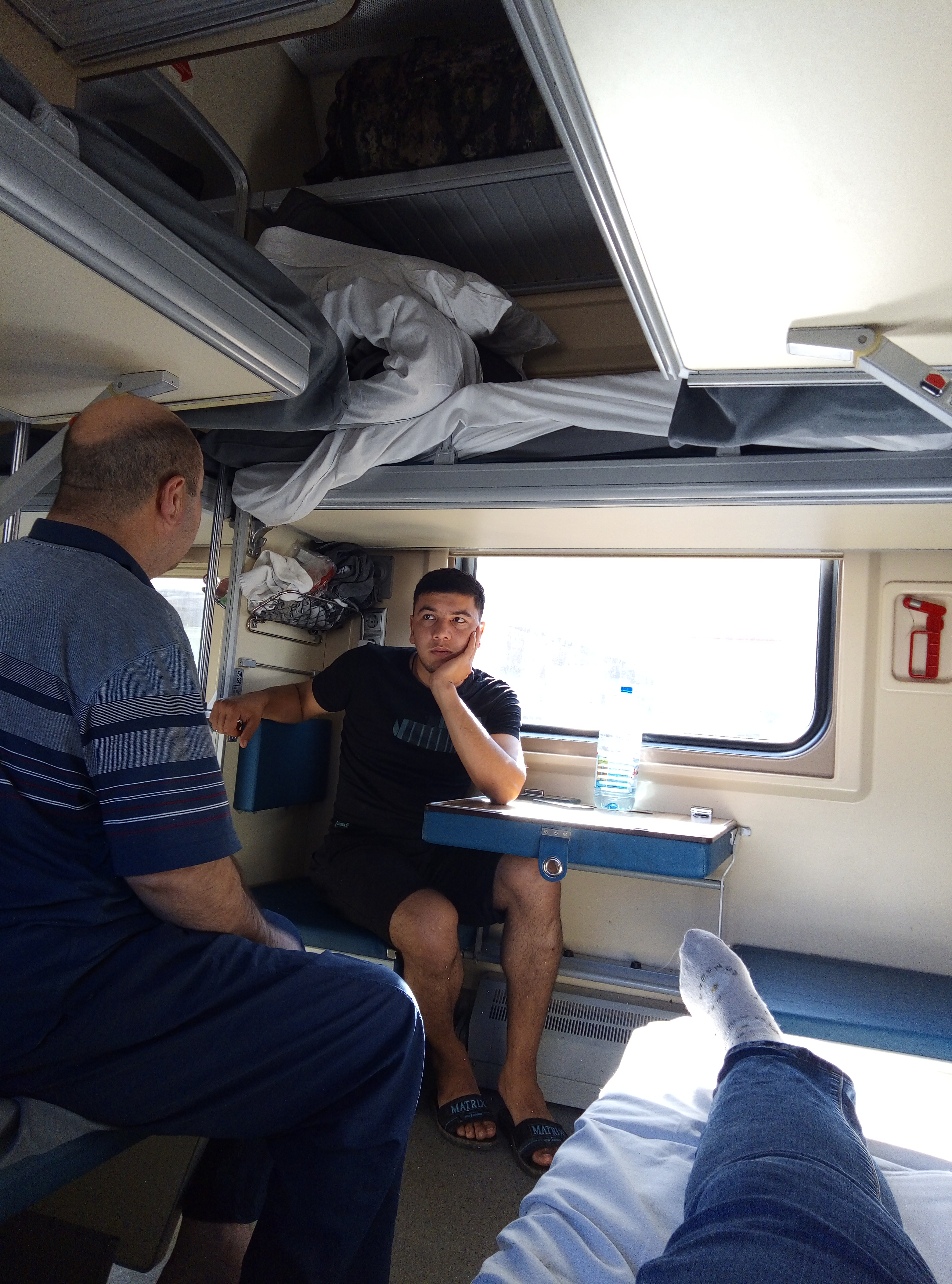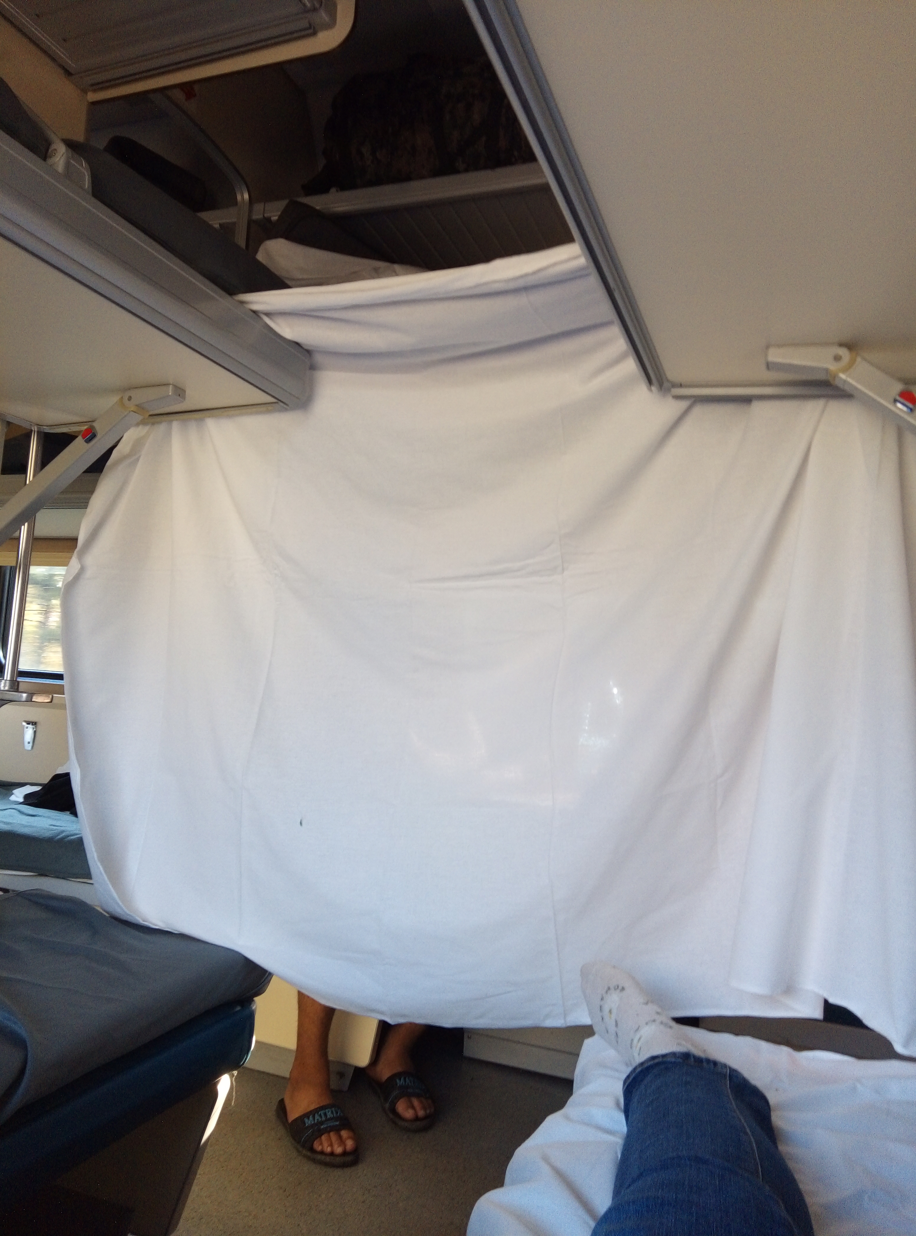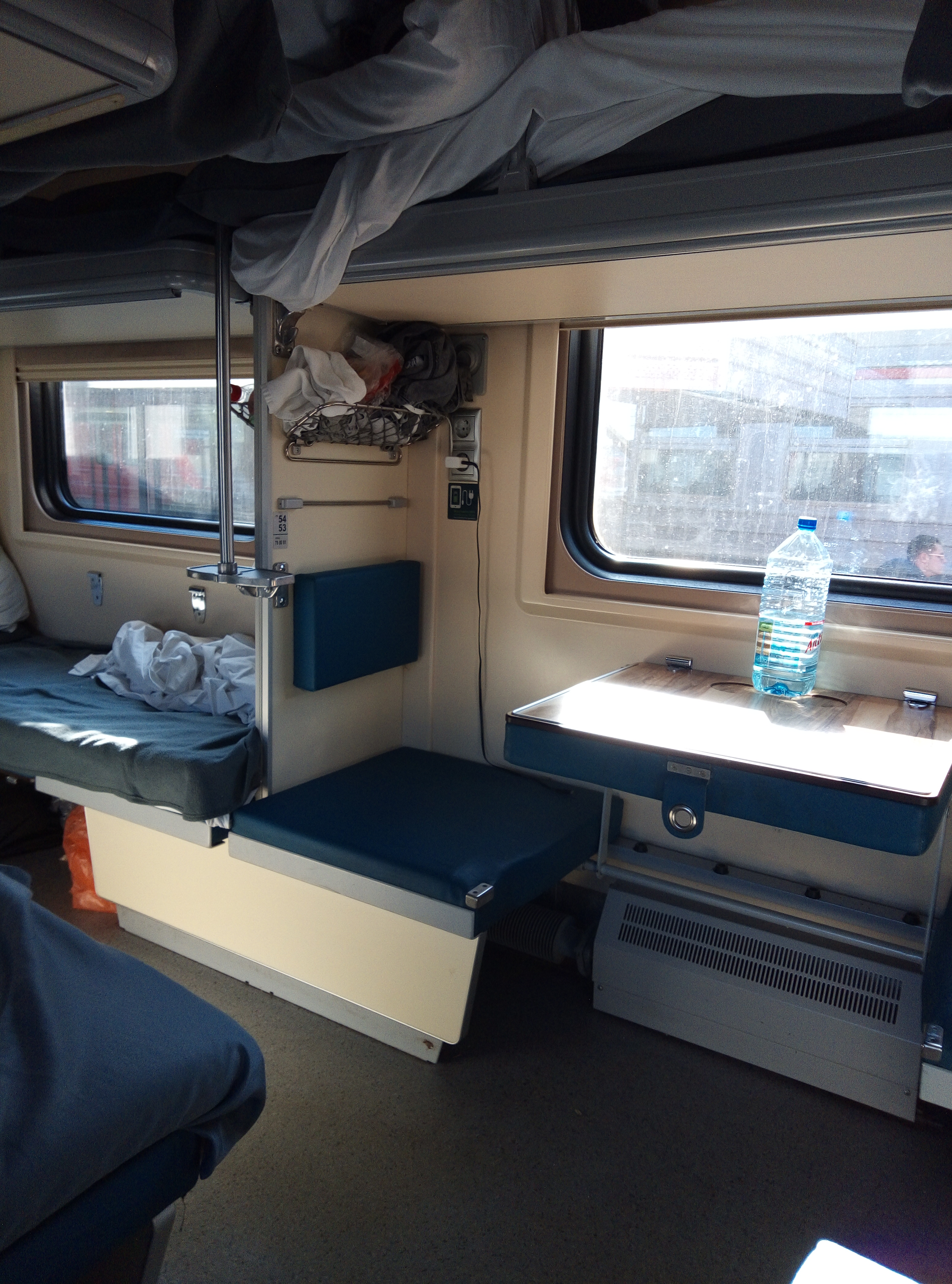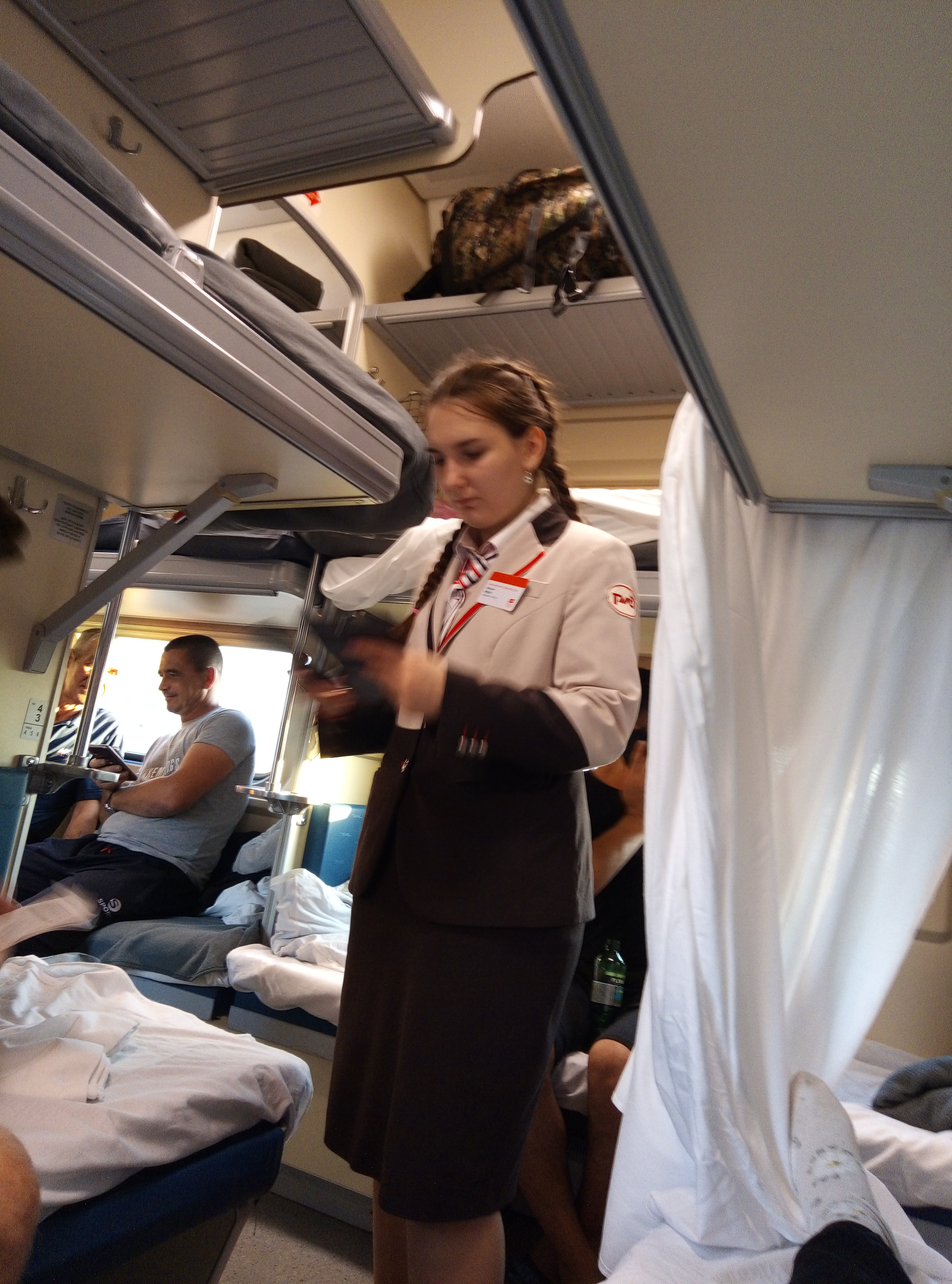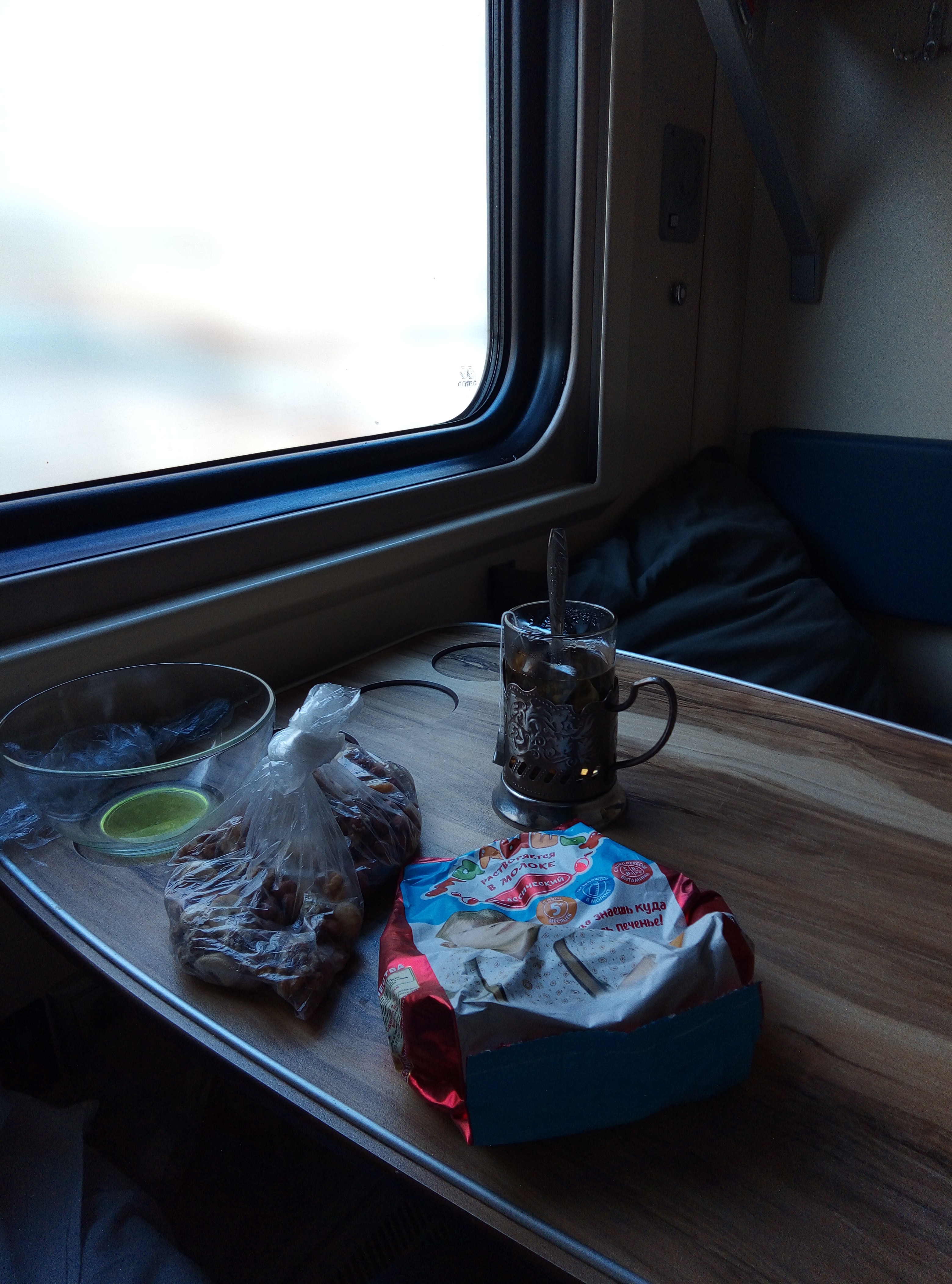 Еду. Все утро протрындела с одним железнодорожным другом, потом полы вымыла, посуду, чтобы Алене оставить чистую квартиру. Забыла взять носки, взяла только 3 шт, а 8 шт остались. Эх. На вокзале успела сходить в столовую, сьеда солянку и кабачки тушенные(190р). Когда еще поем нормально. Поезд Россия новенький, с душем, и даже есть автомат с кофем и снеками. Вместо титана, типа куллера что-то. Пока только 1 сосед на боковушке, нерусский мужчина, к нему сразу пришли в гости - нерусских мужчин, уселись в моем отсеке и стали громко трындеть на своем языке. Я мысленно взвыла. У меня настроение сразу испортилось. Это так будет 5 суток?? До Хабаровска? Но, через полчаса они ушли в свои отсеки. И мой сосед куда то лег спать. Я повесила простынь, кайфово. Пару часов поспала, качаясь, как в колыбельке. Кроме носков, забыла купить воду, но в автомате она есть по 75р за литр. Еду, пью чай, купленный у проводницы в подсиаканнике, грызу орешки, смотрю в окно. Там золотая осень, и очень хочется гулять, свежего воздуха, движения, прогулок. Тело какое-то у меня необузданное, все время ему что-то подавай. В Тюмени сядет 1 сосед на нижнюю полку. Надеюсь, не с ребёнком. Интернета нет почти всю дорогу. Проводница одна на 2 вагона, молодая девушка застенчивая. В вагоне идеальная чистота, моет пол уборщица, пахнет хорошо.