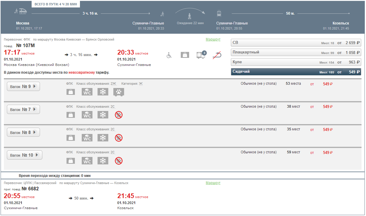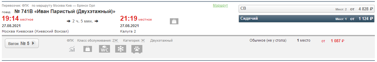Несколько минут назад видел 1124 до Калуги:Знак вопроса:Во вторник до Сухиничей он был ≈ 1500 руб., до Калуги - на 200 - 300 руб. меньше. Точную сумму не помню.Какой этот двойной тариф до Калуги?И повторю еще раз исходное сообщение: на ближайшую пятницу на 741 продано >140 мест до Калуги и Сухиничей (несмотря на двойной тариф) а это - почти 3 сидячих вагона. Причем это было по состоянию на вчерашний вечер, поэтому спрос здесь гораздо выше, его хватит и на 5 - 6 сидячих вагонов по нормальной цене!