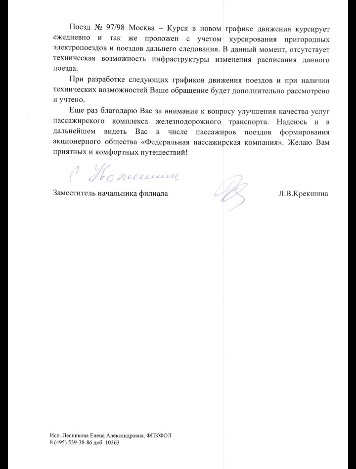 В Курск график шикарный. Обратно бестолковый, ну так Белгород с Осколом к вашим услугам.+ и без того еще большая тянутость поезда № 97/98 Москва - Орел - Курск.