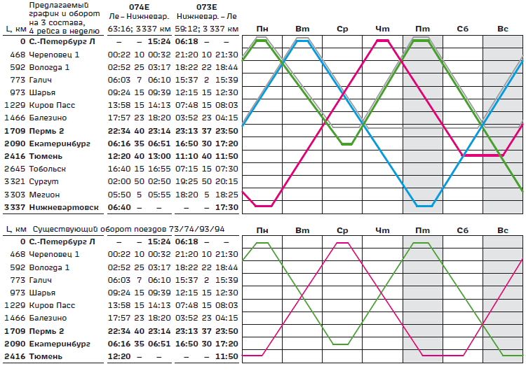 Пару лет назад было по-другому: тюменский ходил также двумя составами с частотой 2 рейса / 5 суток, при этом по Тюмени почти сутки стоял, а среднесуточный пробег вагона был 964 км/сут. По пиковым периодам ходил также поезд 133/134 Нижний Тагил - Ле - Нижний Тагил. Периодичность 2-4 рейса / 5 суток приводила к тому, что терялось 40-60% "вкусных" дней недели. С осени 2010 года тюменский курсирует по 14-суточному графику, по 1-3-5-- по Санкт-Петербургу, два рейса до Тюмени и один до Екатеринбурга, пробег вырос до 989 км/сут. Нижнетагильский с графика 2011/12 упразднён, что сразу привело к дефициту (нефирменных) мест как на сам Нижний Тагил, так и на направлении Ле - Буй..Пермь, хотя 74/94 ходит полной схемой - 17 вагонов (в т.ч. 5 - пермская прицепка). Есть сведения, что в 73Е/74Е из пассажиров, севших в Тюмени, половина (если не больше) следует от/до Сургута-Нижневартовска с пересадкой по Тюмени, т.к. прямого поезда на Питер нет. Ещё энное число пассажиров пересаживается в Екатеринбурге с нижневартовского.