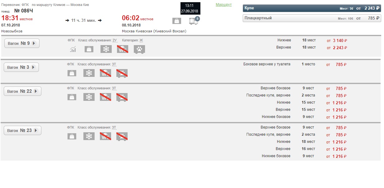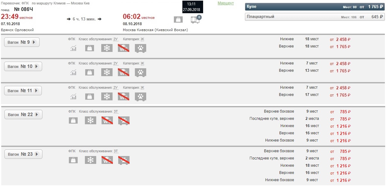 От Брянска три купейных (9,10, 11) и два плацкартных (22 и 23), на полный маршрут 1 купейный (9) и три плацкартных (22, 23, в 3 вагоне одно место).
