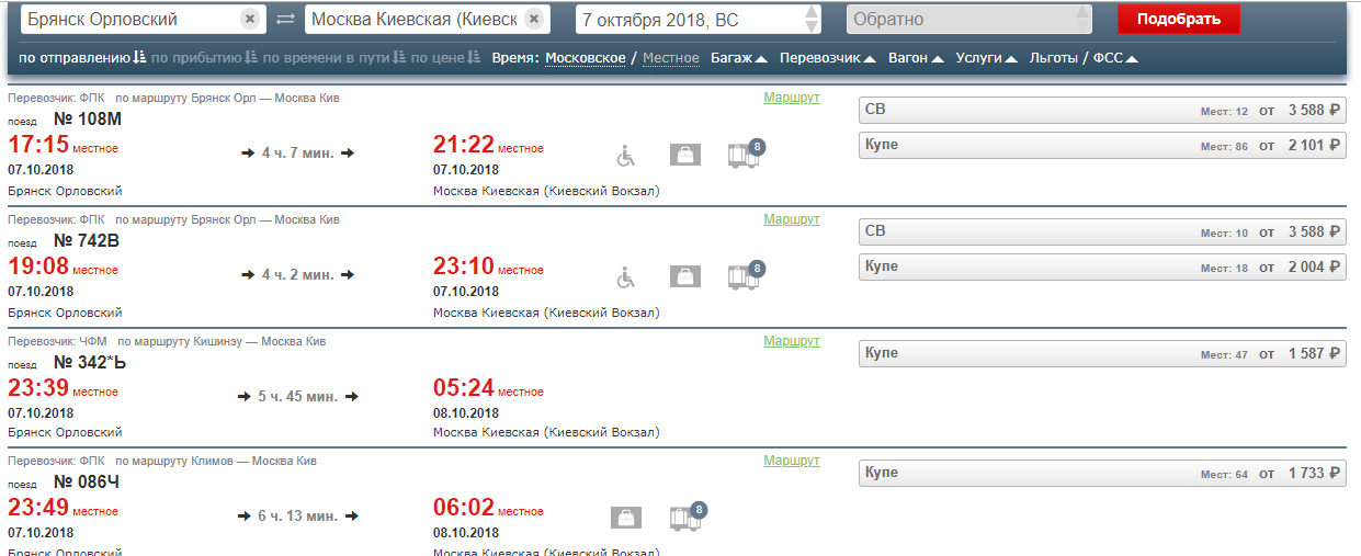 От Климова до Брянска доступно 196 мест в купейных вагонах, 260 место в плацкартных, 26 мест в сидячем.