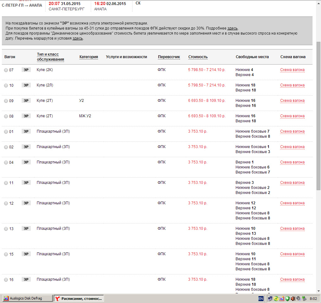 С марта ежедневно просматриваю варианты с Питера до Анапы. Начиная с 29 апреля появился №259 в продаже, есть возможность купить через инет.Время обновления билетов на следующие дни на сайтах и кассах одновременно, как пишут на сайте РЖД, в 8:00 утра. Третий день наблюдаю картину что поступая в продажу все билеты на нижние места плацкарта все заняты, есть несколько боковых и много верхних. Спрашивается - где билеты? Они что сразу автоматически в бронь на турфирмы заранее заблокированы. В течении дня новых не появляется, только потихоньку раскупают боковушки. а что же в сезон будет???