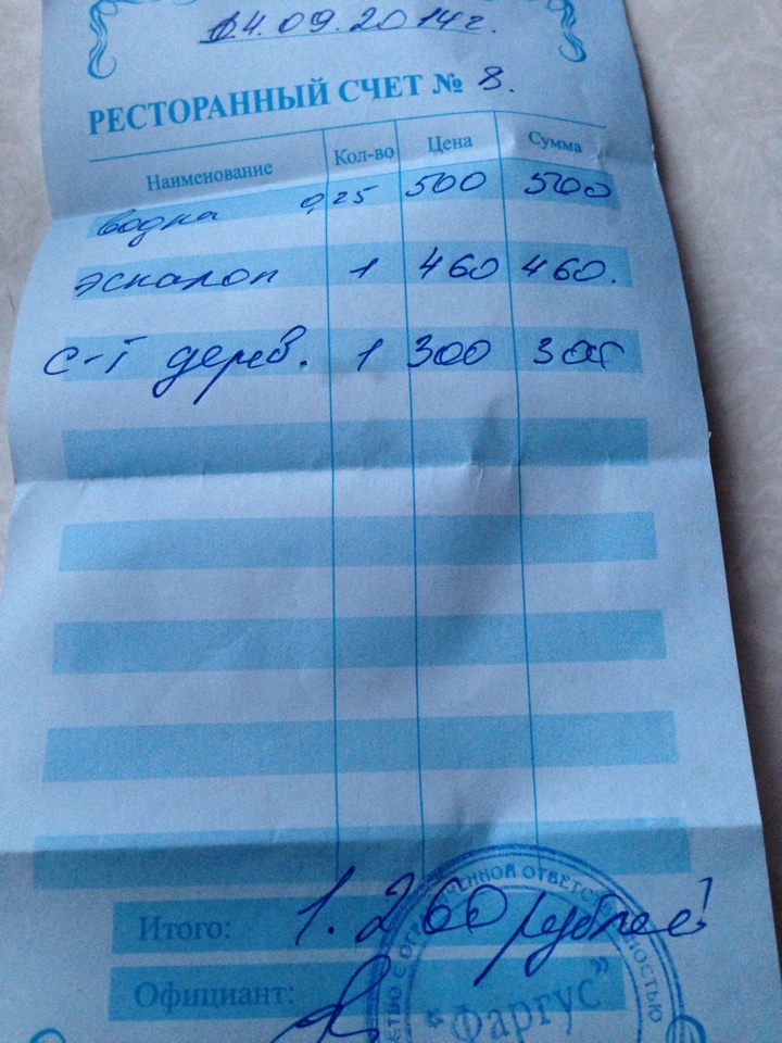 Мда, 8 счет в ресторане под конец 6-дневного оборота) Это ещё явно штук 5-6 были заказы 2 банок пива))