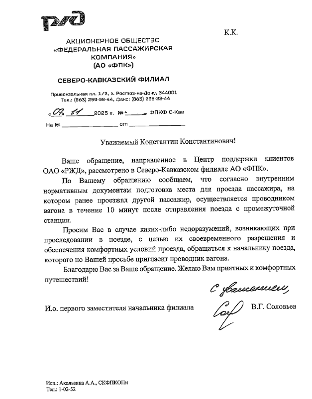 А вот и официальный ответ пришёл, на мой вопрос "Могу ли я по прибытию поезда сразу занять своё место и попросить постель?" (дело было бы по ст. Краснодар-1, транзитная со стоянкой 46 минут.