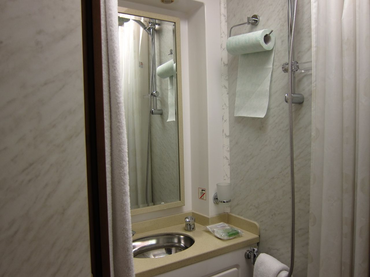 Погрузившись в вагон и проследовав в свое первое купе, выяснилось, что интерьер вагона и оборудование купе полностью совпали с примерными ожиданиями. Фотографии представлены выше. Замечу лишь, что кроме климат-контроля такие вещи, как проигрыватель и телевизор нахожу совершенно бесполезными. В шкафу наличествовала металлическая приставная лестница на верхнюю полку, а также банный набор (халаты и тапочки). Санкабина выполнена для такой маленькой площади весьма грамотно - сужу по массе пережитых откровенно убогих санкабин в каютах теплоходов по внутренним водным путям РФ. Что характерно, кнопка смыва находится рядом с зеркалом над умывальником. И в санкабине, и в купе имеются розетки 220В и кнопки вызова проводника.