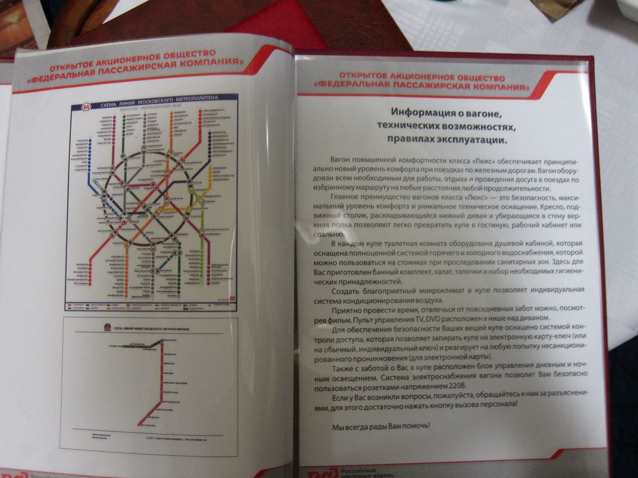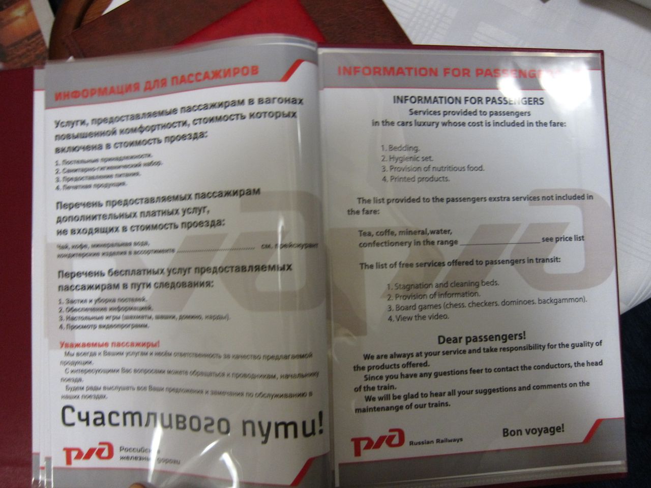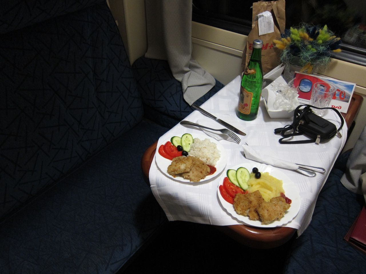 По обслуживанию. Две проводницы за 40, в меру любезны. Осведомляются о знакомстве с оборудованием купе, рассказывают, показывают при необходимости. Сразу же по отправлении появилась девушка из ресторана с вопросом, какой из предложенных трех вариантов горячего питания (приведены на фотографиях выше) принести. В данной ситуации разум, склонявший не принимать ужин из трех блюд, вступил в жестокий конфикт с совестью, настаивавшей на необходимости воспользоваться оплаченными услугами. Компромисс был найден в виде одного второго блюда, зафиксированного на фото, и сока, доставленных примерно через 45 минут после отправления. От настойчиво предлагаемых официанткой пирожков пришлось отбиваться. Кроме информационного буклета и информации про предлагаемые на выбор рационы горячего питания в купе имеется и полный вариант ресторанного меню с возможностью дозаказа за отдельную плату. Запакованный сухпай (также зафиксирован на фото) по отправлении уже дожидался на столе. Услуги в билете У1, но выдаются рационы питания для двоих человек. Использованную посуду забирает проводник, вызываемый по кнопке. Также проводница осведомилась о времени побудки.