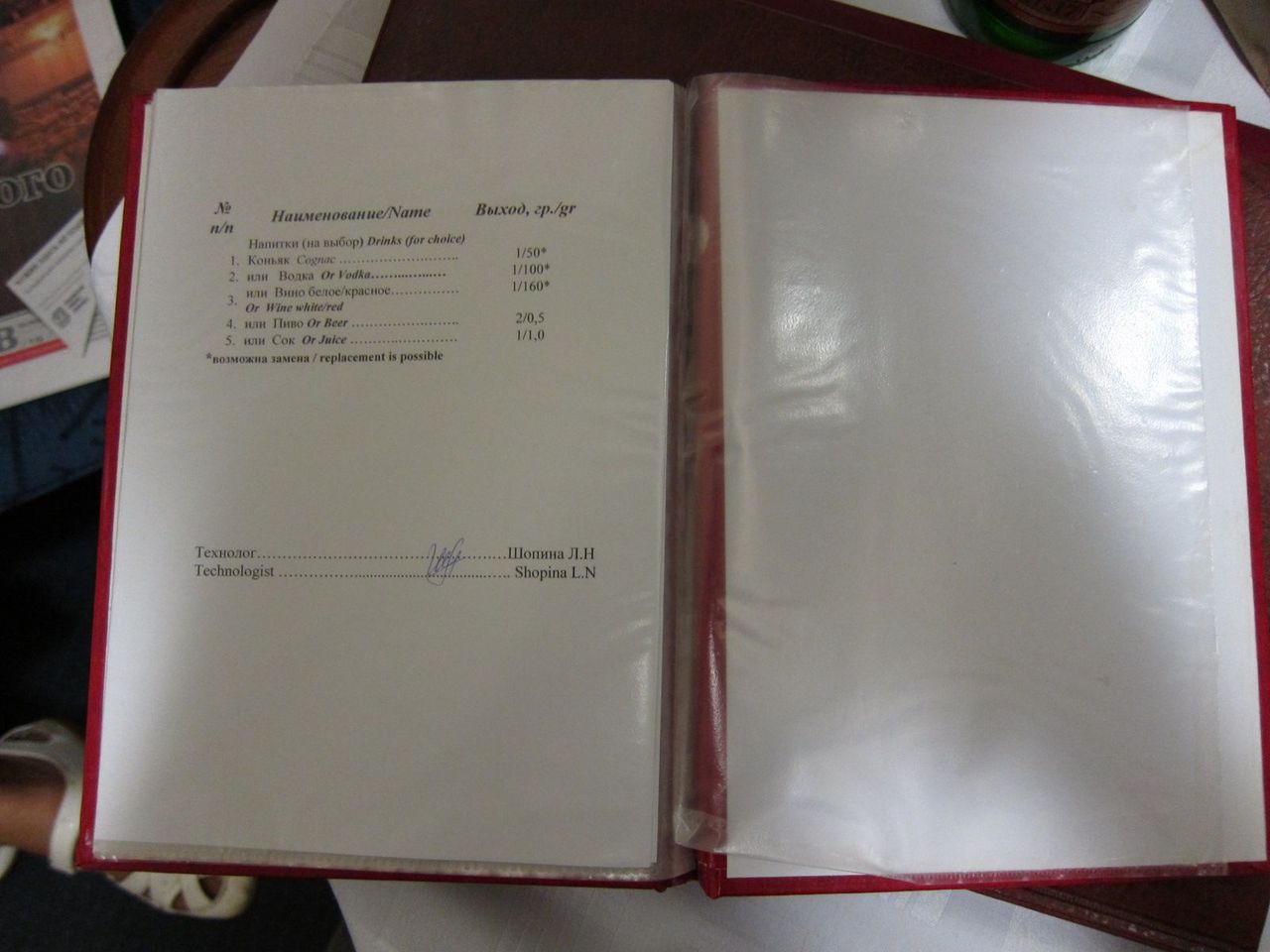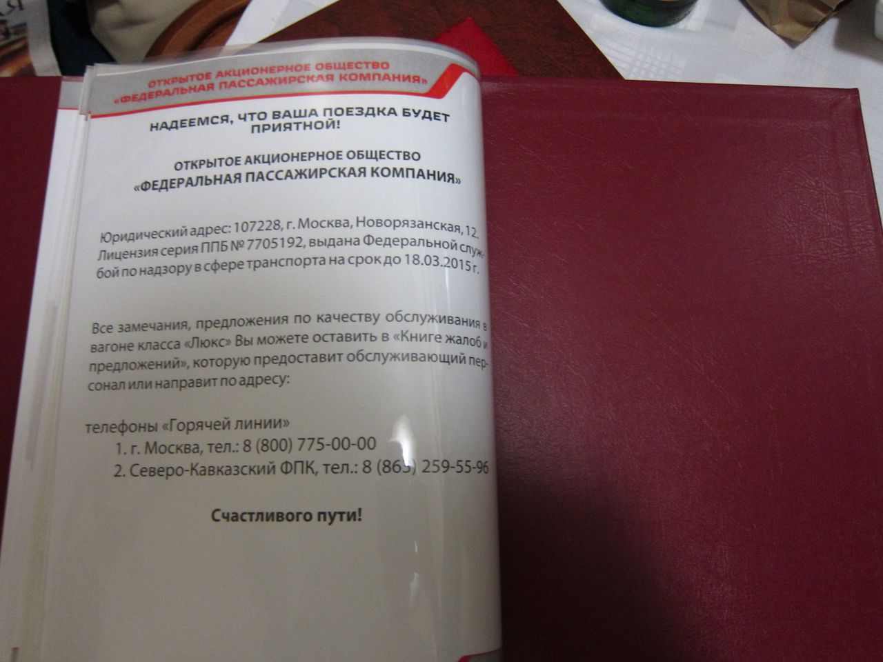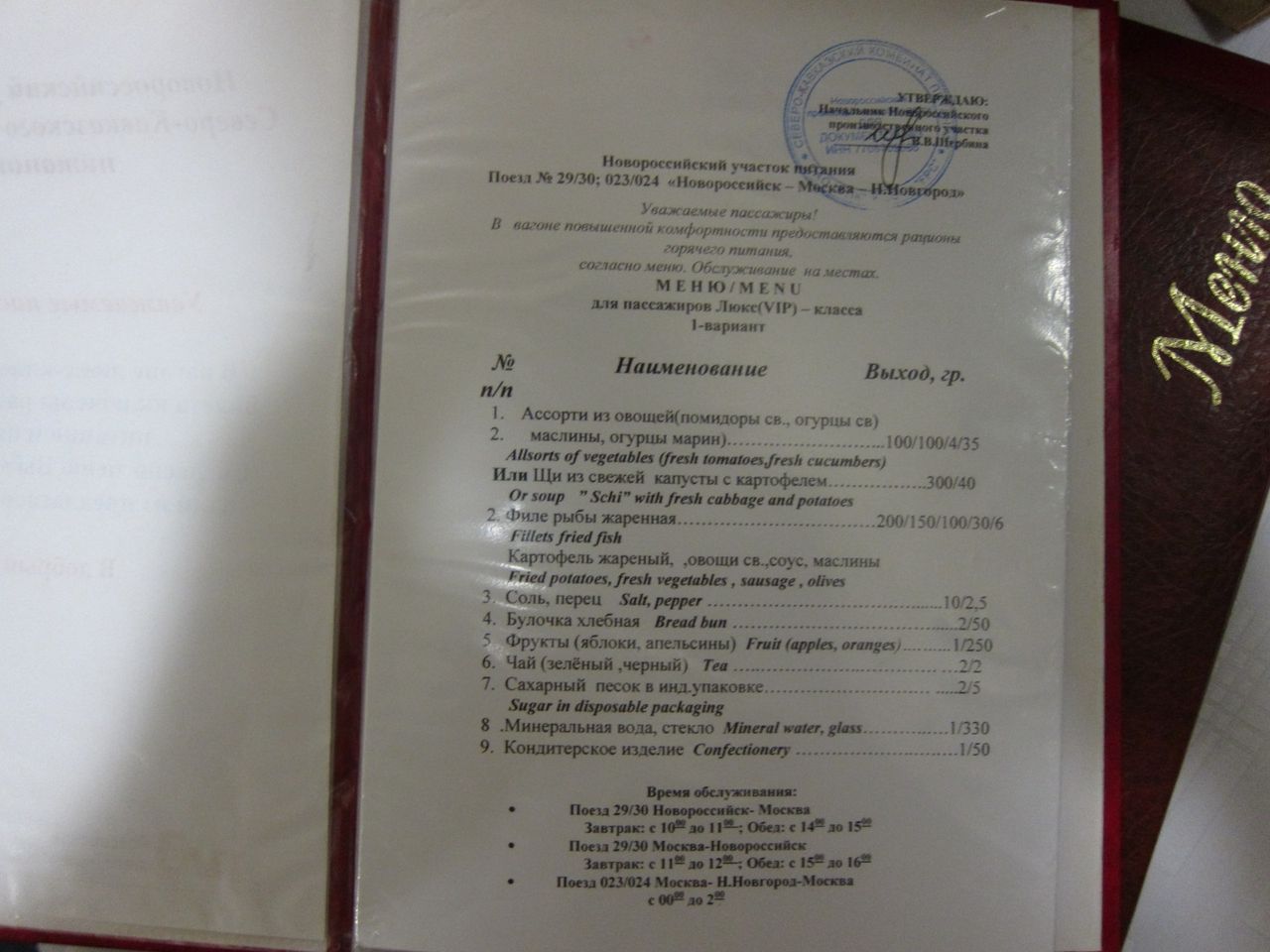 По обслуживанию. Две проводницы за 40, в меру любезны. Осведомляются о знакомстве с оборудованием купе, рассказывают, показывают при необходимости. Сразу же по отправлении появилась девушка из ресторана с вопросом, какой из предложенных трех вариантов горячего питания (приведены на фотографиях выше) принести. В данной ситуации разум, склонявший не принимать ужин из трех блюд, вступил в жестокий конфикт с совестью, настаивавшей на необходимости воспользоваться оплаченными услугами. Компромисс был найден в виде одного второго блюда, зафиксированного на фото, и сока, доставленных примерно через 45 минут после отправления. От настойчиво предлагаемых официанткой пирожков пришлось отбиваться. Кроме информационного буклета и информации про предлагаемые на выбор рационы горячего питания в купе имеется и полный вариант ресторанного меню с возможностью дозаказа за отдельную плату. Запакованный сухпай (также зафиксирован на фото) по отправлении уже дожидался на столе. Услуги в билете У1, но выдаются рационы питания для двоих человек. Использованную посуду забирает проводник, вызываемый по кнопке. Также проводница осведомилась о времени побудки.