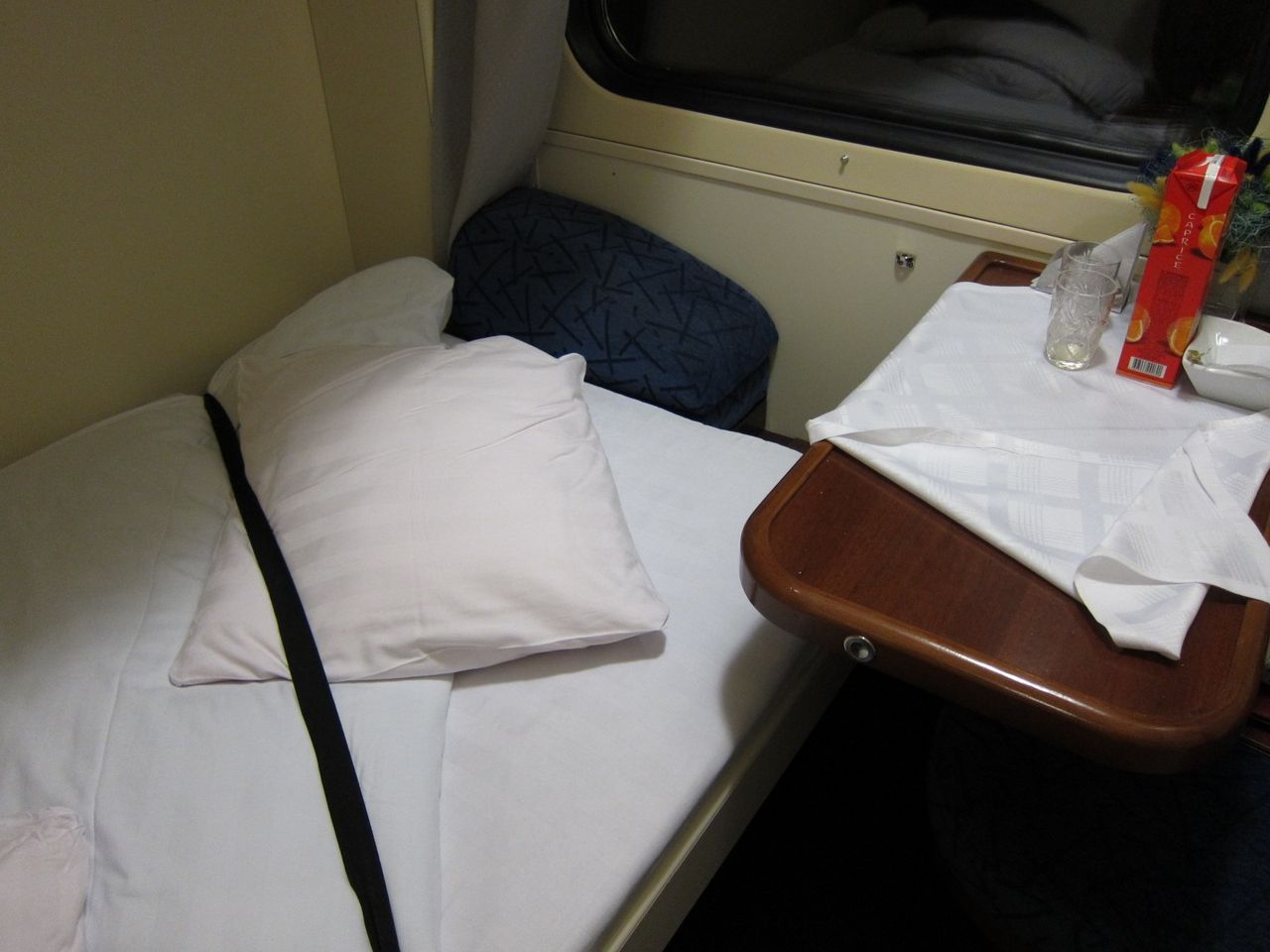 Нижний диван весьма широк и раскладывается только при сдвигаемом столе, в результате сесть на сиденье напротив не возможно. Это пожалуй единственный недостаток в оборудовании купе. А так купе достаточно просторное, мне казалось, что будет Уже.