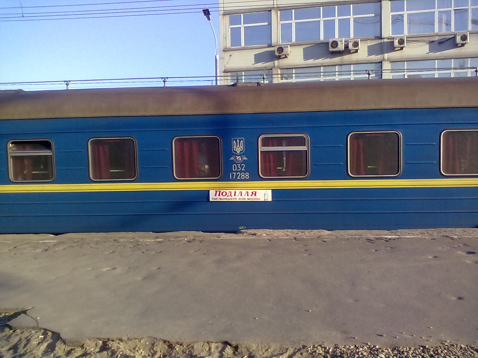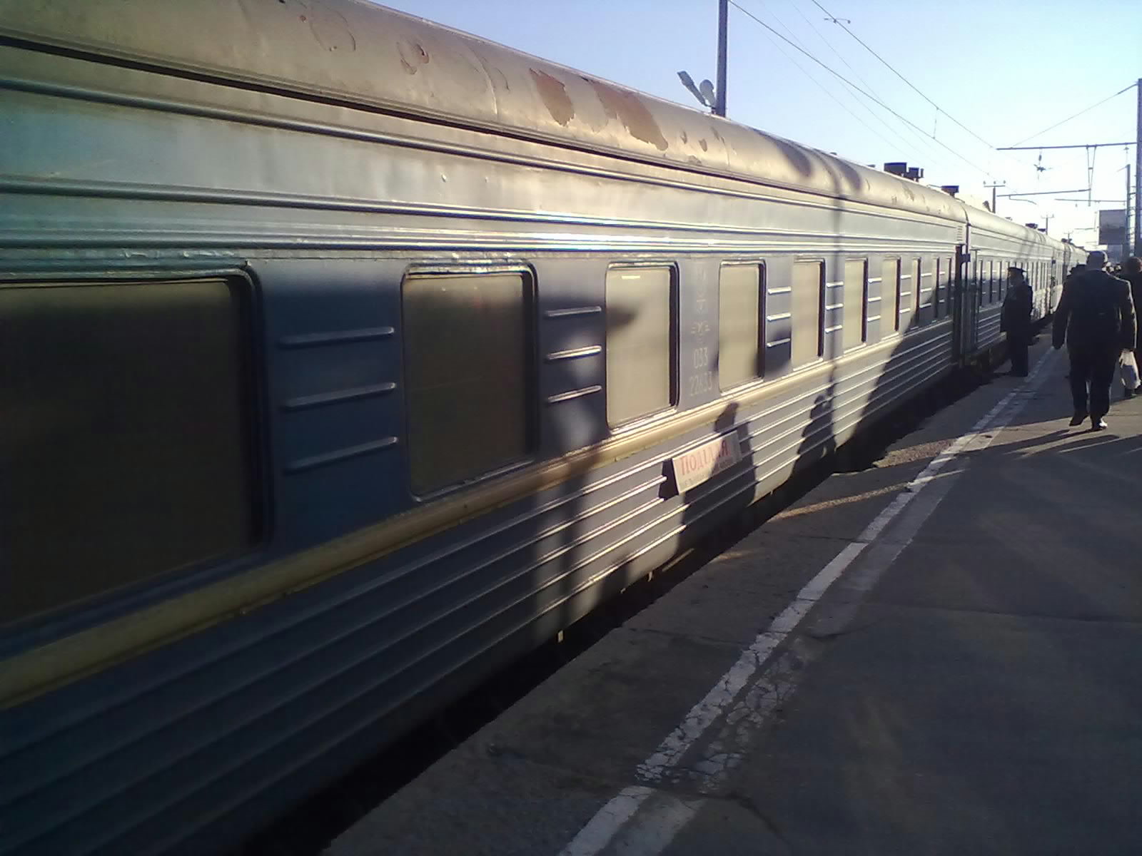 Провожал родственников в Москву на этот поезд. Нумерация вагонов с конца поезда. Купейные и СВ вагоны шоколадные Аммендорфы в основном без кондиционеров с деревянными рамами и стеклопакетами. Плацкартные вагоны КВЗ с деревянными рамами. Вагон 05К шоколадный Аммендорф без кондиционера. Нумерация вагонов с хвоста поезда. Два вагона (4К и 5К) остановились возле заграждения. Вагоны старые но ухоженные. Приятно ехать. И в этот раз проводница хвостового вагона стояла у рабочего тамбура с флагами и рацией. В этот раз все сесть успели, и ровно по расписанию поезд отправился. Поезд прибыл под украинским ЧС4.