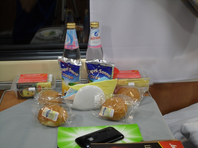 Питание принесли ещё до отправления, пока шёл таможенный контроль, в питание вошёл плов и кусок красной рыбы. В сухпаёк входили сок, минеральная вода, шоколад и желе. Так на столике были журналы и гигиенический набор с зубно щёткой, пастой, ложкой для обуви, расчёской. В глаза сразу бросилось, что размер купе меньше, чем в украинском составе, багажная полка так же была меньше и не вместила мой чемодан. Вторую половину поездки до Москвы в вагоне было сильно душно и утром решил иногда держать дверь купе открытой, чтобы дуло с открытых окон в проходе. Так же вагон сильно трясло большую часть дороги, чего не было заметно в украинском составе.