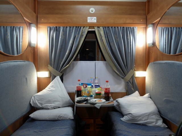 При посадке в купе было прохладно и свежо, уже лежал весь сухпаёк входящий в стоимость билета. Прошлись работники ресторана сказали, что принесут питание, потом прошёлся другой работник ресторана предлагавший купить еду в купе из меню.