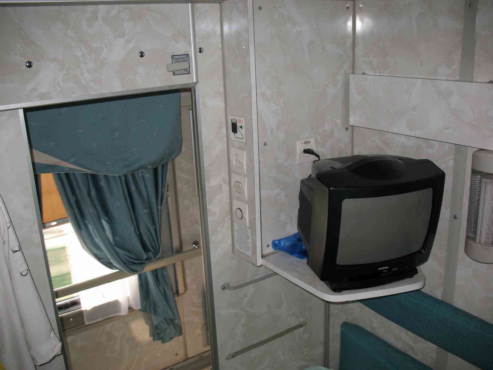 3) Первые впечатления – внутри вагон после капремонта (Днепропетровский КВР), но уже не новый, не все работает (сломано табло индикации температуры и занятости туалета, не работают светиль-ники у полок). Есть мягкие спинки для удобства сидения. Работает кондиционер (класс обсл. 3Э). В окнах – стеклопакеты. Титан работает.