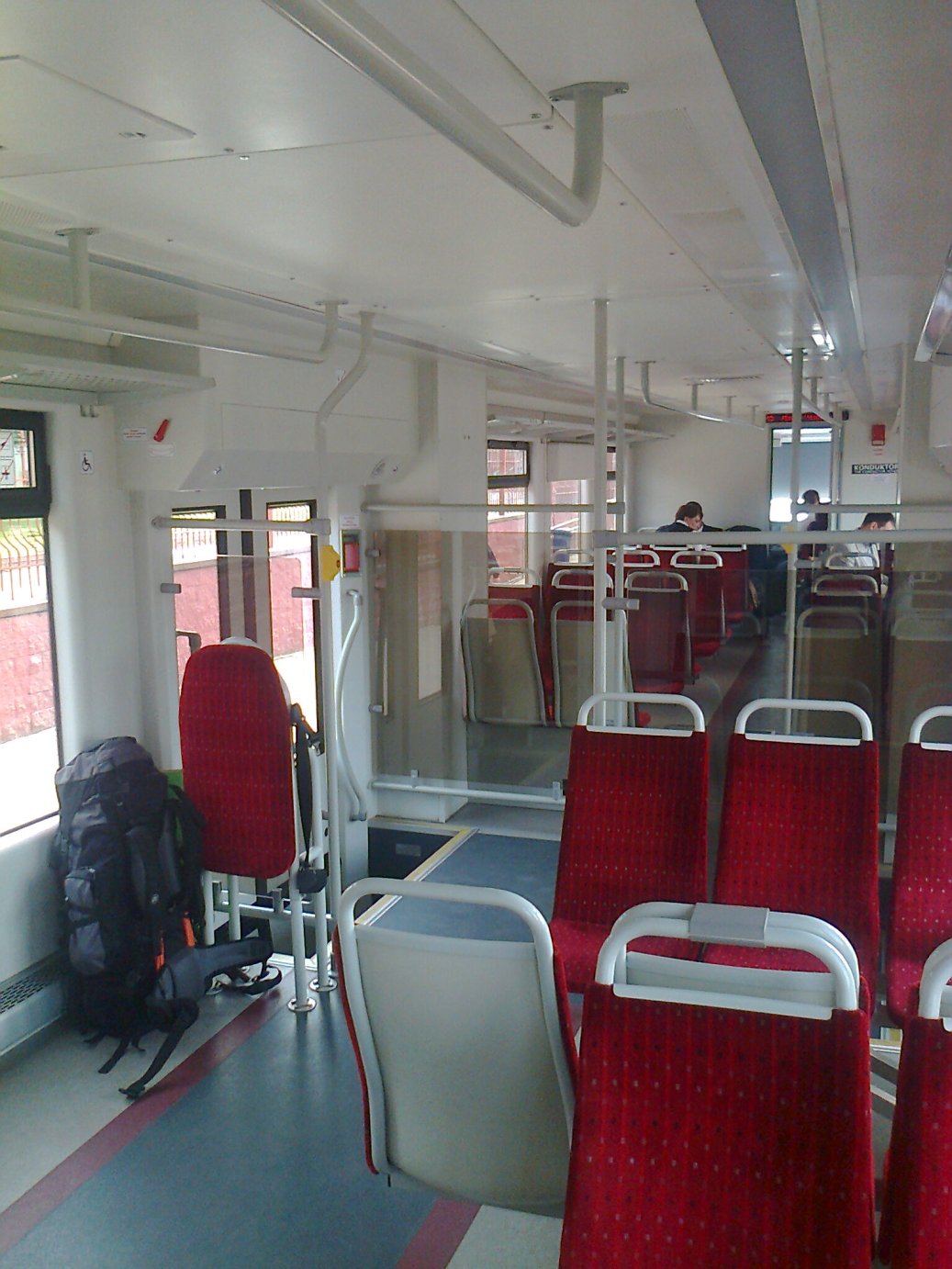 Салон дизеля чист, поскрябонностей и потертостей нет, не пыльно. Само расположение сидений в салоне смахивает на городской автобус и в принципе не предназначено для передвижения по межгороду с временем хода 2,5+. При росте 186 сидеть друг на против друга с подобного же роста соседом нет никакой возможности :(. Рассаживались в шахматном порядке - благо, что свободные места имелись. При покупке билета ориентировался на схему украинского штадлера и прокололся, "хорошие" места не совпали. Оптимальными местами на данном маршруте являются №№44-45, они лишены соседей напротив и расположены по ходу поезда.