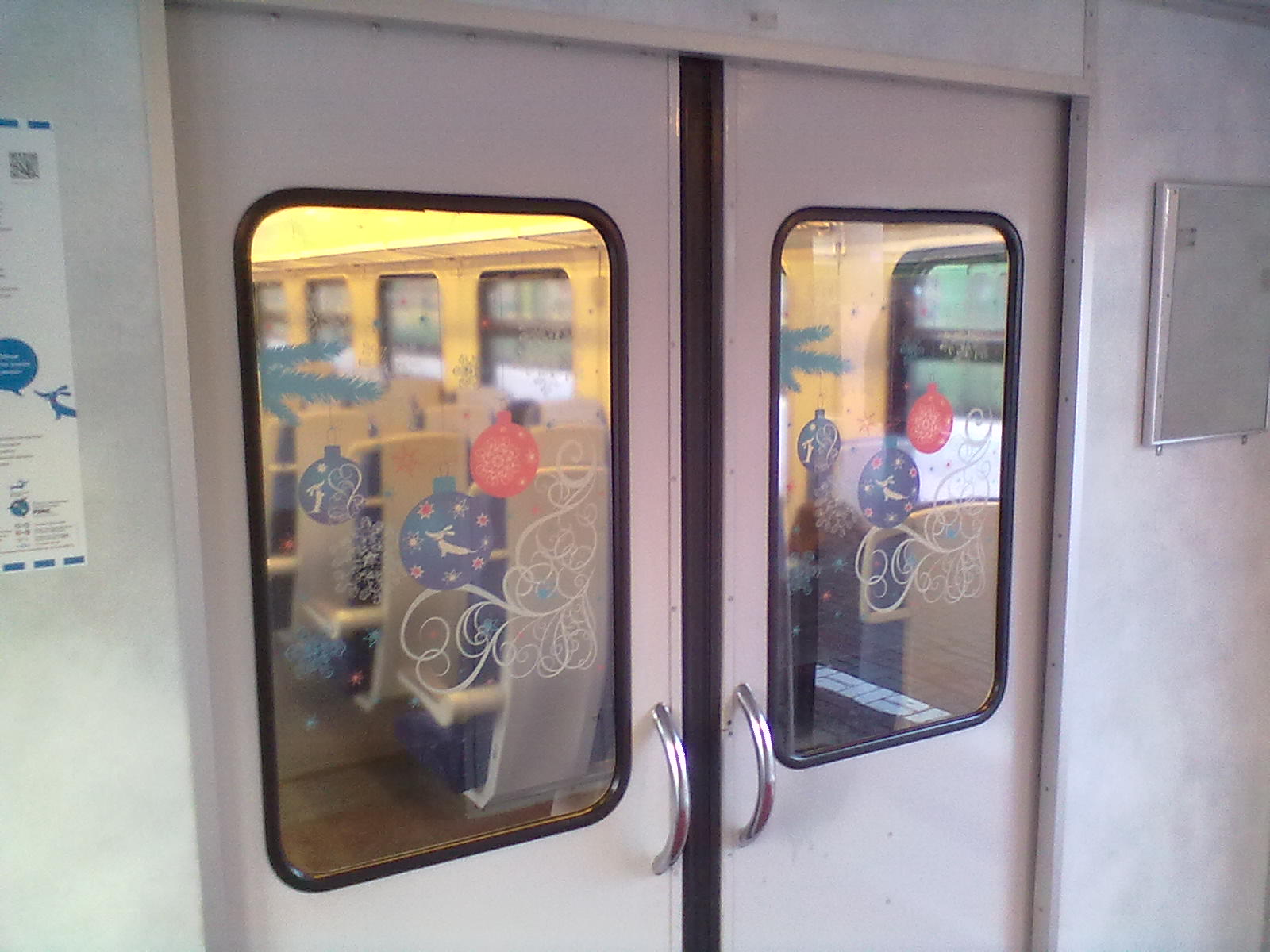 Сегодня ездил по маршруту Москва - Долгопрудная - Москва на ЭД4М-0252. Внутри - без изменений. Немного украсили тамбурные двери к Новому году.