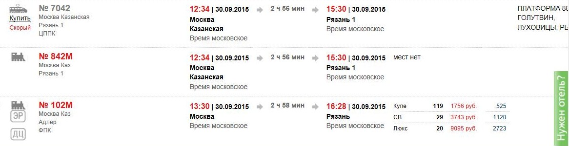 Иван: Смотрю - на сегодня [09.09.2015] от Москвы до Рязани на экспресс в 12:34 на сайте РЖД нет билетов. Неужели всё раскупили?! :=-O: Обычно этот экспресс уходит с 300, а то и 400 свободными местами. Или это глюк?