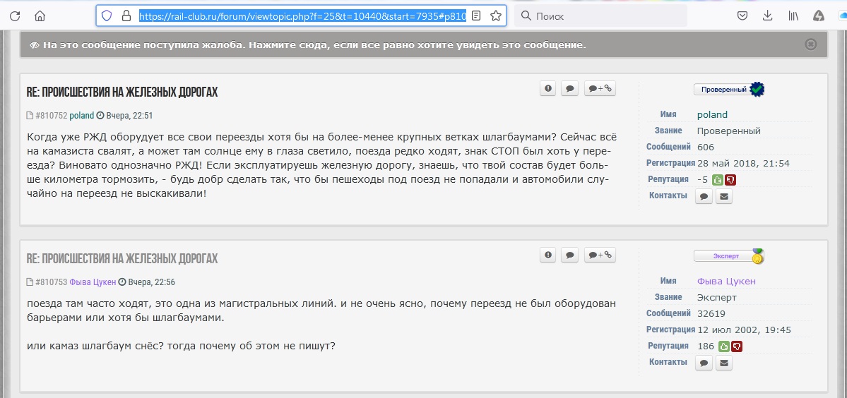 Предлагаю компромиссный вариант - в конце каждого месяца публиковать список участников форума, обжалующих сообщения с количеством обжалованных ими сообщений за месяц.Администратор:LmV » 30-07-2024, 13:42:Если показывать того, кто жалуется, то на форуме будут непрекращающиеся разборки.![]()
