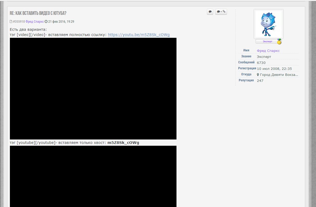 тэг [video][/video]- вставляем полностью ссылку: https://youtu.be/m5Z8Sk_cOWg