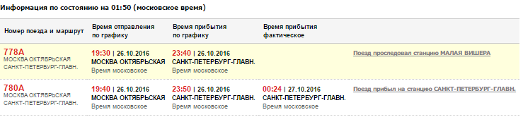 Фонтанка. Выдержка из: http://www.fontanka.ru/2016/10/27/014/...Как сообщает Октябрьская железная дорога, 26 октября в 22.21 на станции Мстинский Мост по техническим причинам был задержан 778-й "Сапсан. "К месту остановки выслан вспомогательный локомотив и резервный "Сапсан". Опоздание поезда составит ориентировочно 2,5-3 часа. Для развозки пассажиров к местам жительства (порядка 500 человек) будут предоставлены три автобуса", – уточнили в ОЖД.