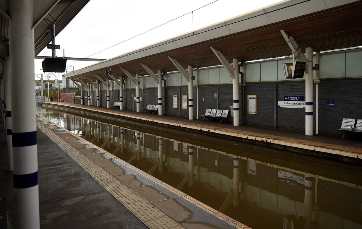 Но и в британской области тоже не все спокойно . Вот, полюбуйтесь на "Утонувшие" железнодорожные пути на центральном вокзале Ротерема, Саут-Йоркшир, Англия. ДС станции Саут Йоркшир Лондонского НЗрег уже пишет объяснение по этому поводу .