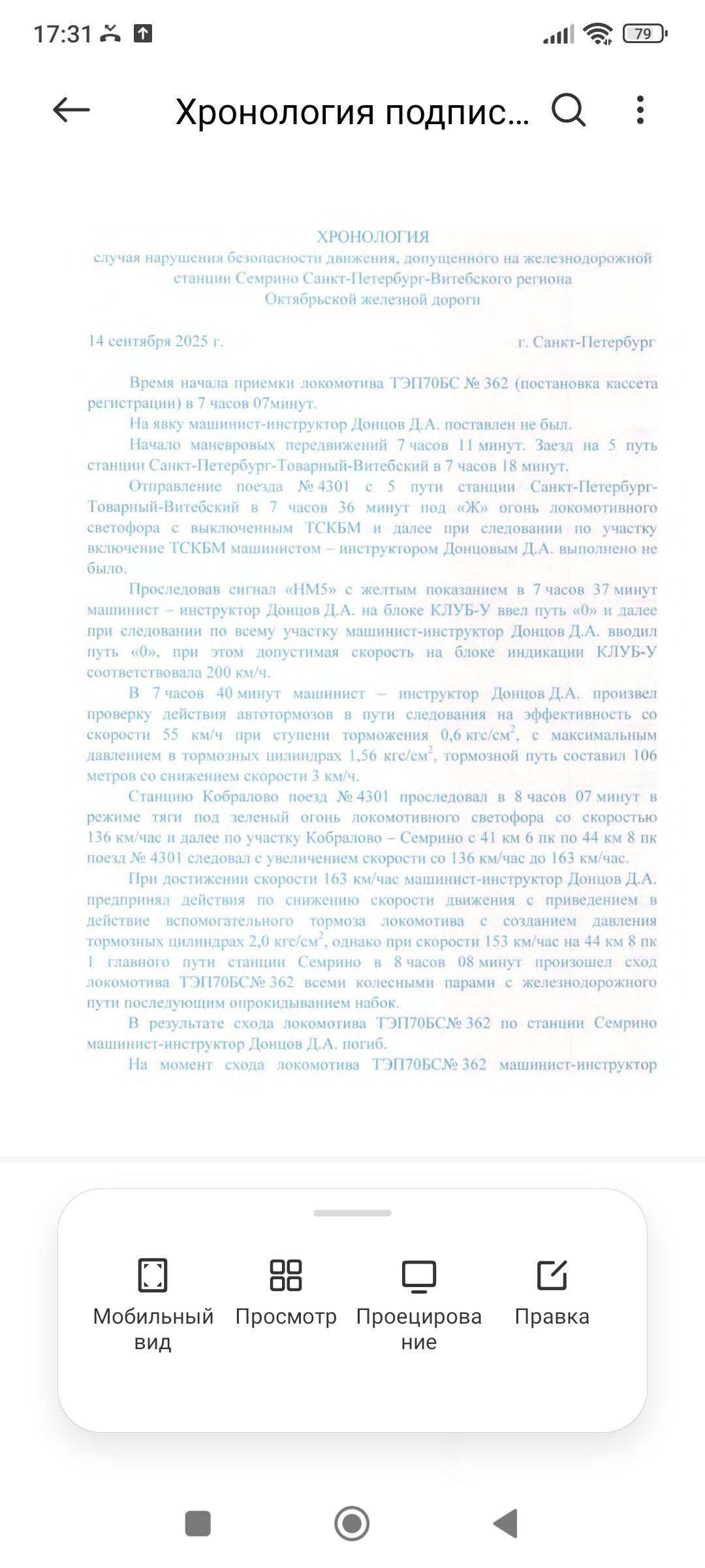 ""В 7:36 локомотив отправился с Санкт-Петербурга-Товарного-Витебского, а к 8:07 проследовал станцию Кобралово со скоростью 136 км/ч. На перегоне Кобралово – Семрино скорость возросла до 163 км/ч. При попытке снизить ее вспомогательным тормозом в 8:08, при скорости 153 км/ч, тепловоз ТЭП70БС сошел с рельсов на 44 км 1-го главного пути станции Семрино и опрокинулся.""