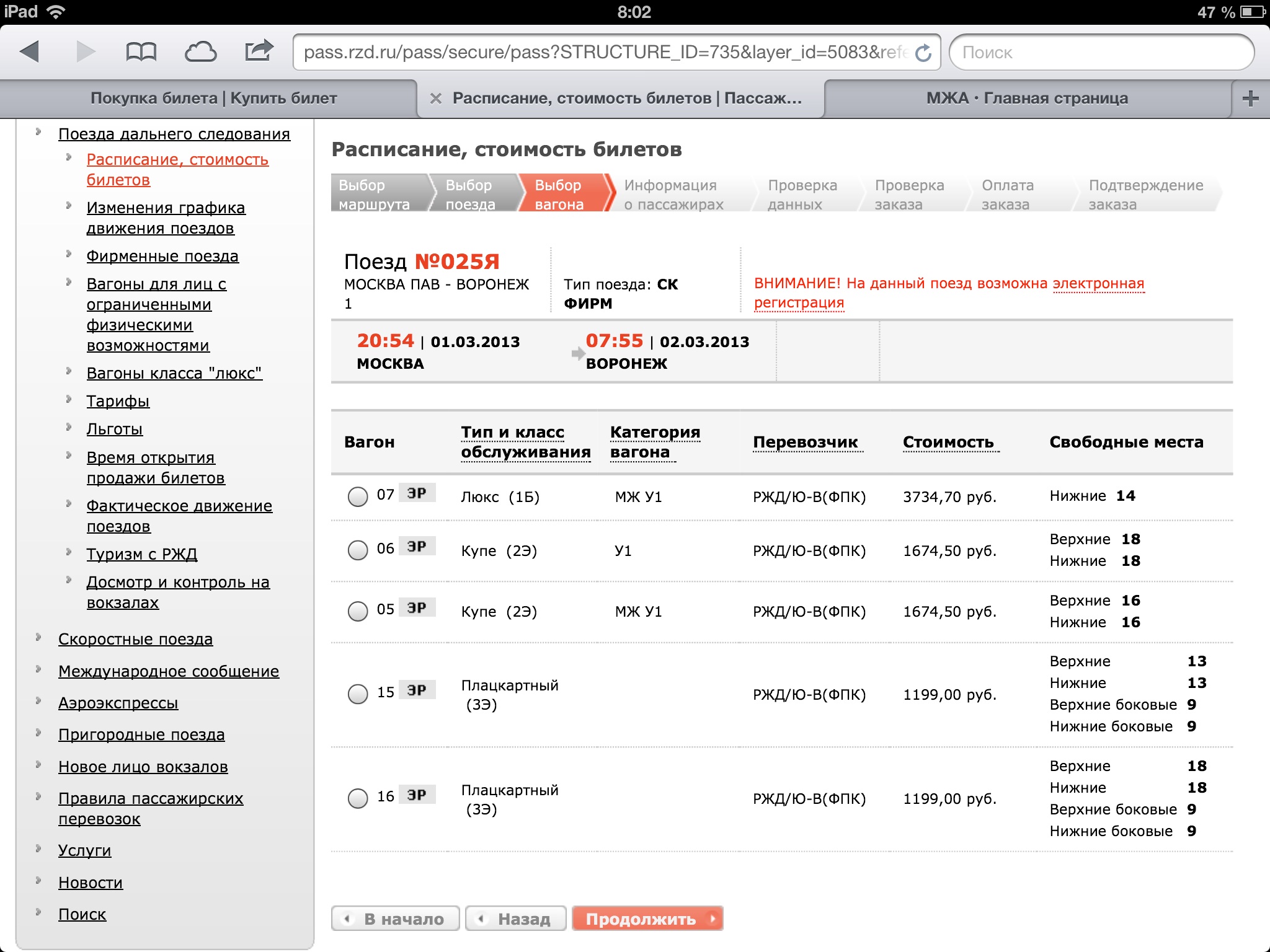 № поезда - стоимость проезда по старой системе при КГР 0.8 на 01.03.2013 / действующая стоимость проезда в плацкарте