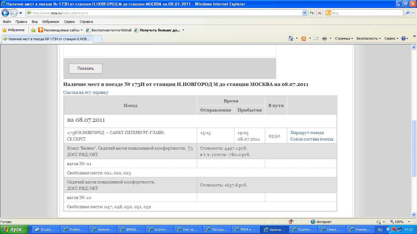 Воспользовавшись наличием свободного времени, решил отмониторить момент появления мест в направлении из Горького до Москвы на Сапсан, отправляющийся в пятницу в 15:15. Естественно, что с утра пятницы уже выдавалось: МЕСТ НЕТ. За 2 часа до отправления появилось два места в бизнес-класс, которые моментально исчезли из продажи. А за час до отправления, или точнее за 55 минут (с учетом округления до 10-минутного интервала) в 14:20 появились свободные места, которые также быстро исчезли из продажи: