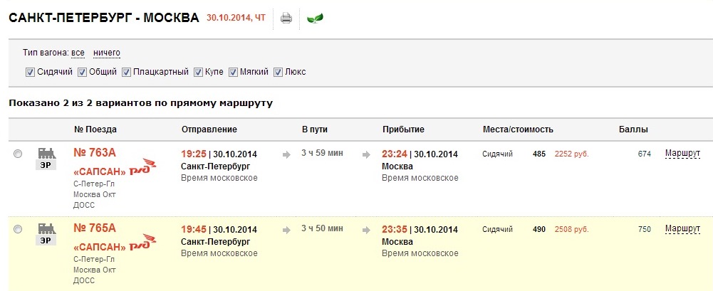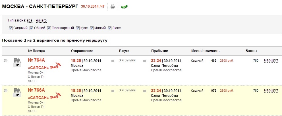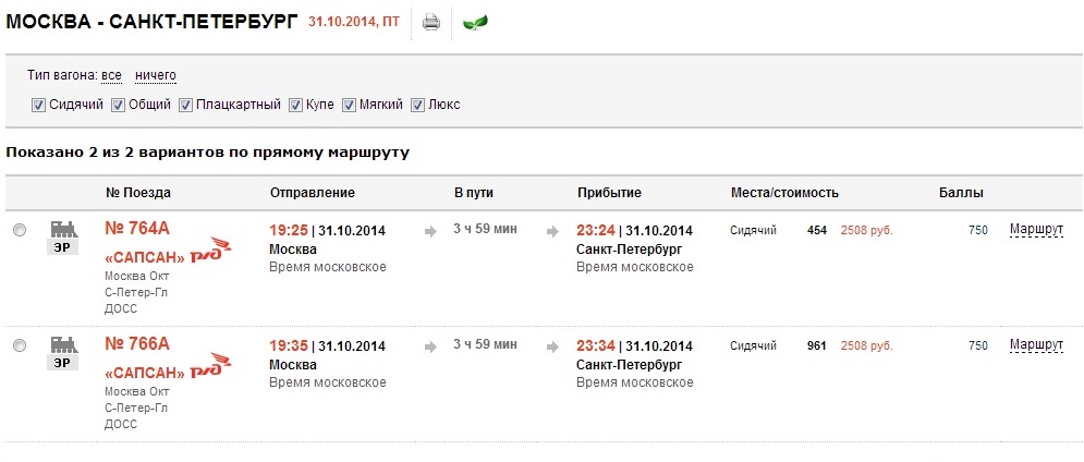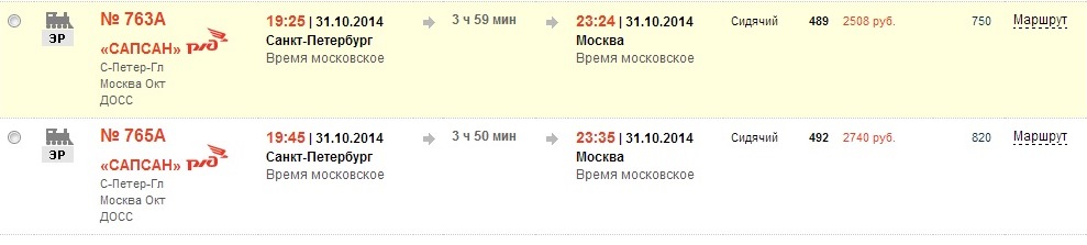 А в направлении Москва-Питер цены одинаковые как на 30, так и на 31 октября (2 508 рублей):
