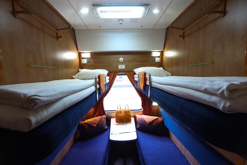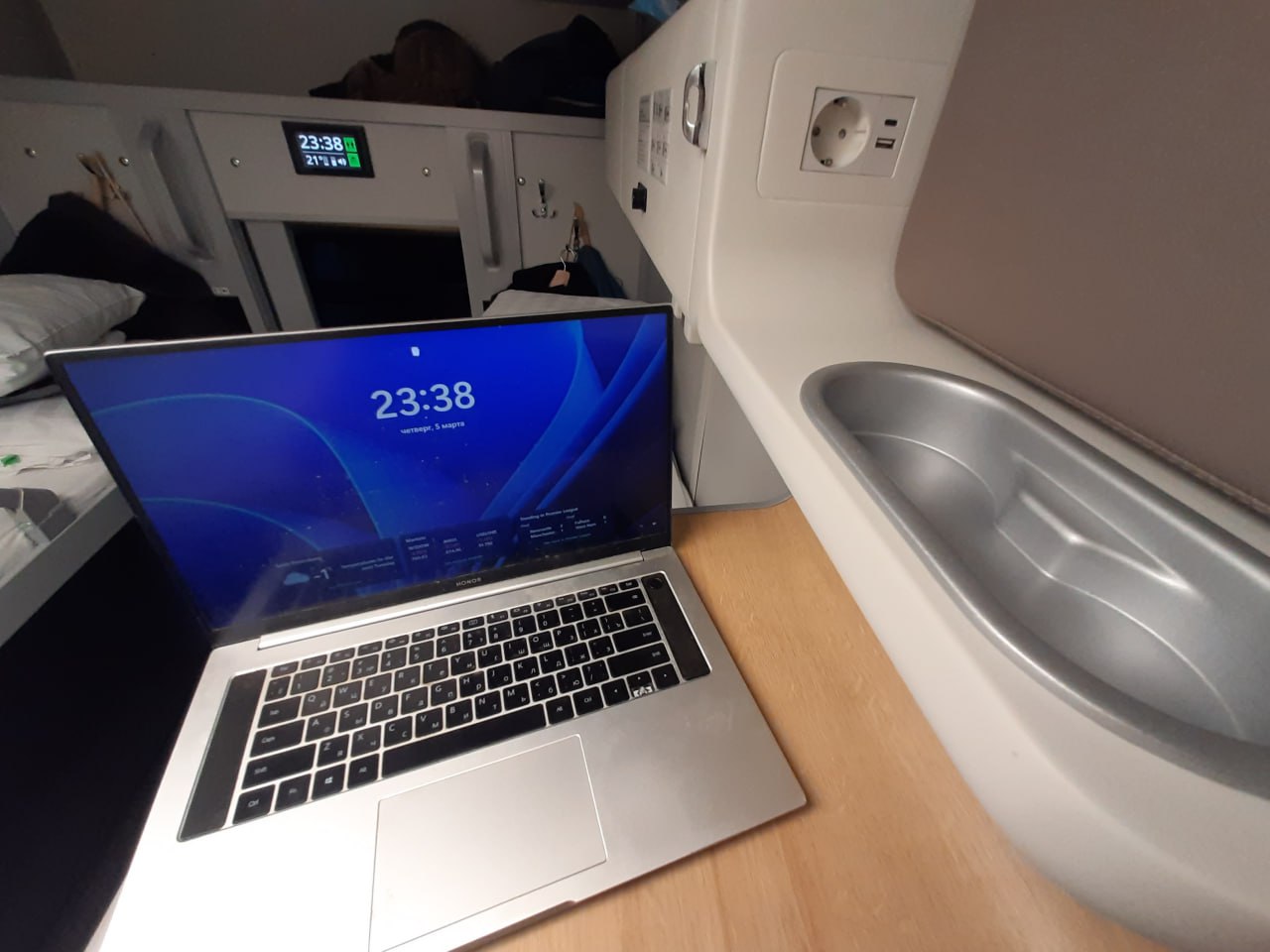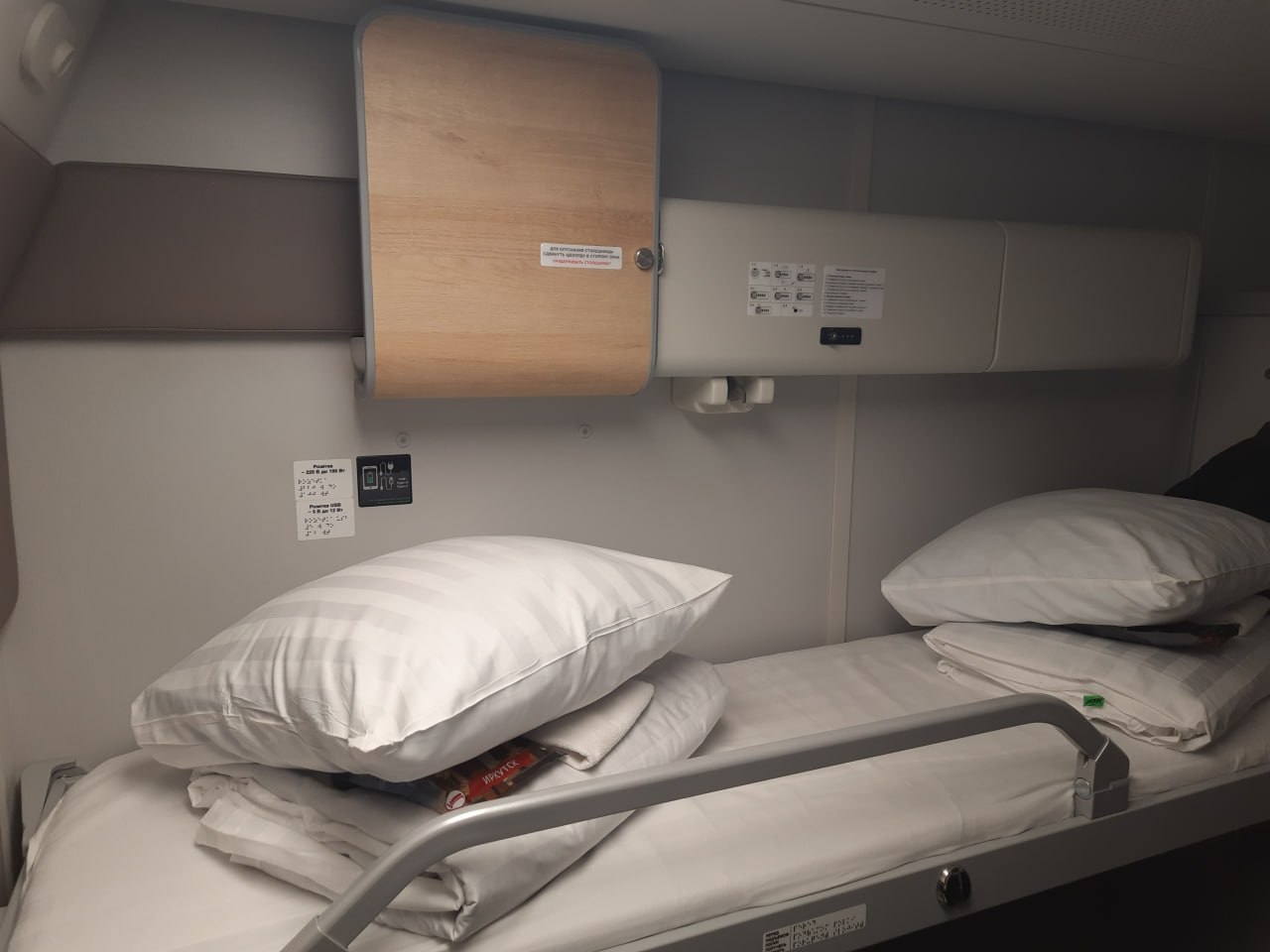 В вагонах габарита Т верхнюю полку усовершенствовали. Теперь там сделали уголок для сидения. У пассажира есть столик (опыт поездки в «Красной стреле» показывает, что он не дребезжит и не отваливается), а также розетка и usb-порты (фото 5, 6, 7)