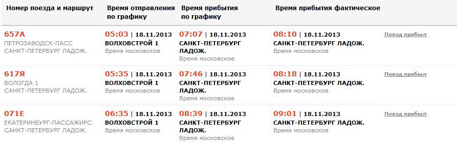 Сегодня ехал в поезде Петербург - Вологда, который опоздал по прибытии. Пассажиры говорят, что последние дни это - нередкость. Посмотрел - другие поезда тоже шли с опозданием. Вбил фактическое движение поездов за вчера и сегодня и увидел, что опоздания носят системный характер. К сожалению, за прошлые дни не посмотреть.