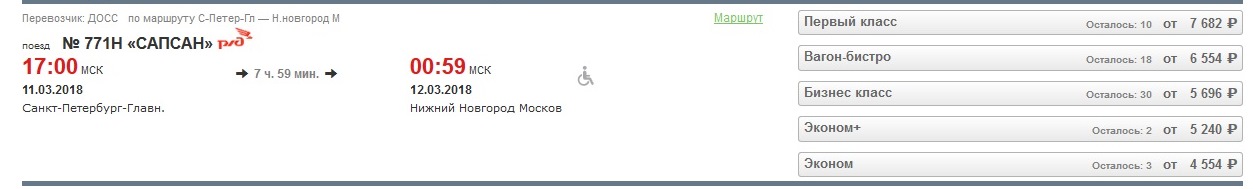 Это дата показательна - она пиковая после 4-х выходных дней. Но это уже не существенно - дело в другом... На Сапсан Питер - Нижний нет ограничений по продаже мест до Москвы. В итоге, на 11 марта от Питера доступно всего лишь три места эконом-класса по цене 7 554 рубля до Москвы и те же самые три места доступны на полный маршрут до НиНо по цене 4 554 руб.