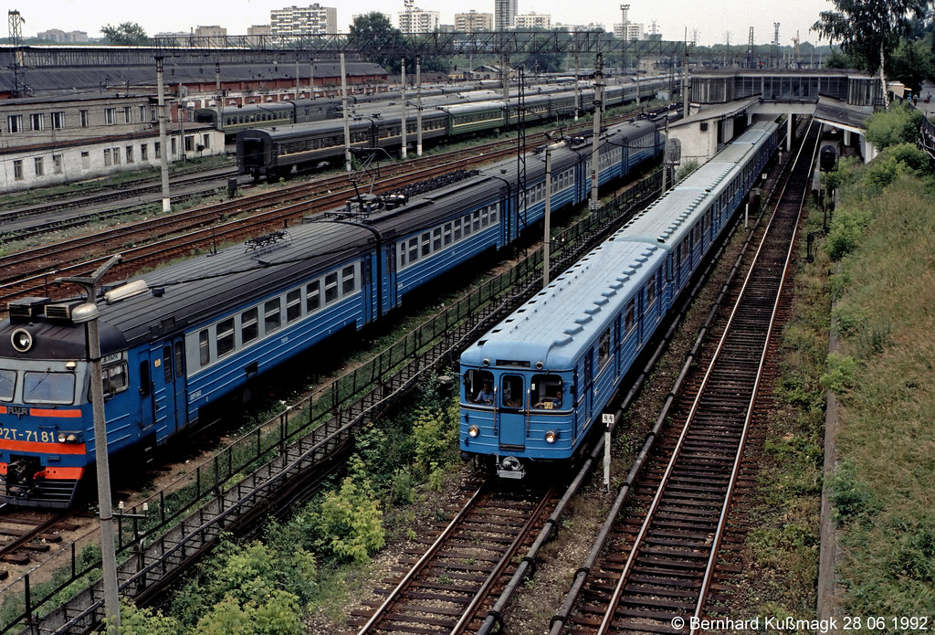 Электропоезд ЭР2Т-7181 и метропоезд из вагонов Ем/Е рядом со станцией метро "Студенческая", город Москва (28.06.1992):