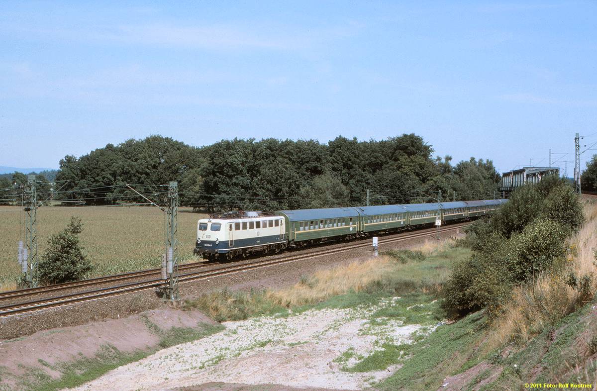 Der ausschließlich aus sowjetischen Wagen gebildete Schlafwagenzug D 1248 Moskva - Köln ist am 08. August 1989 bei Isselhorst-Avenwedde unterwegs. Zuglok ist an diesem Tag ebenfalls die Kölner 110 264. Dieser im Sommer 1989 nur acht Mal verkehrende und östlich Helmstedts als Sonderzug verkehrende Zug diente vorrangig Sowjetbürgern zu Ausreise aus der UdSSR.