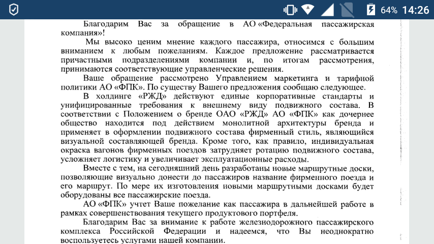Ради прикола писал в виртуальную приёмную РЖД , по поводу индивидуальной окраски фирмачей, и вот ответ пришёл: