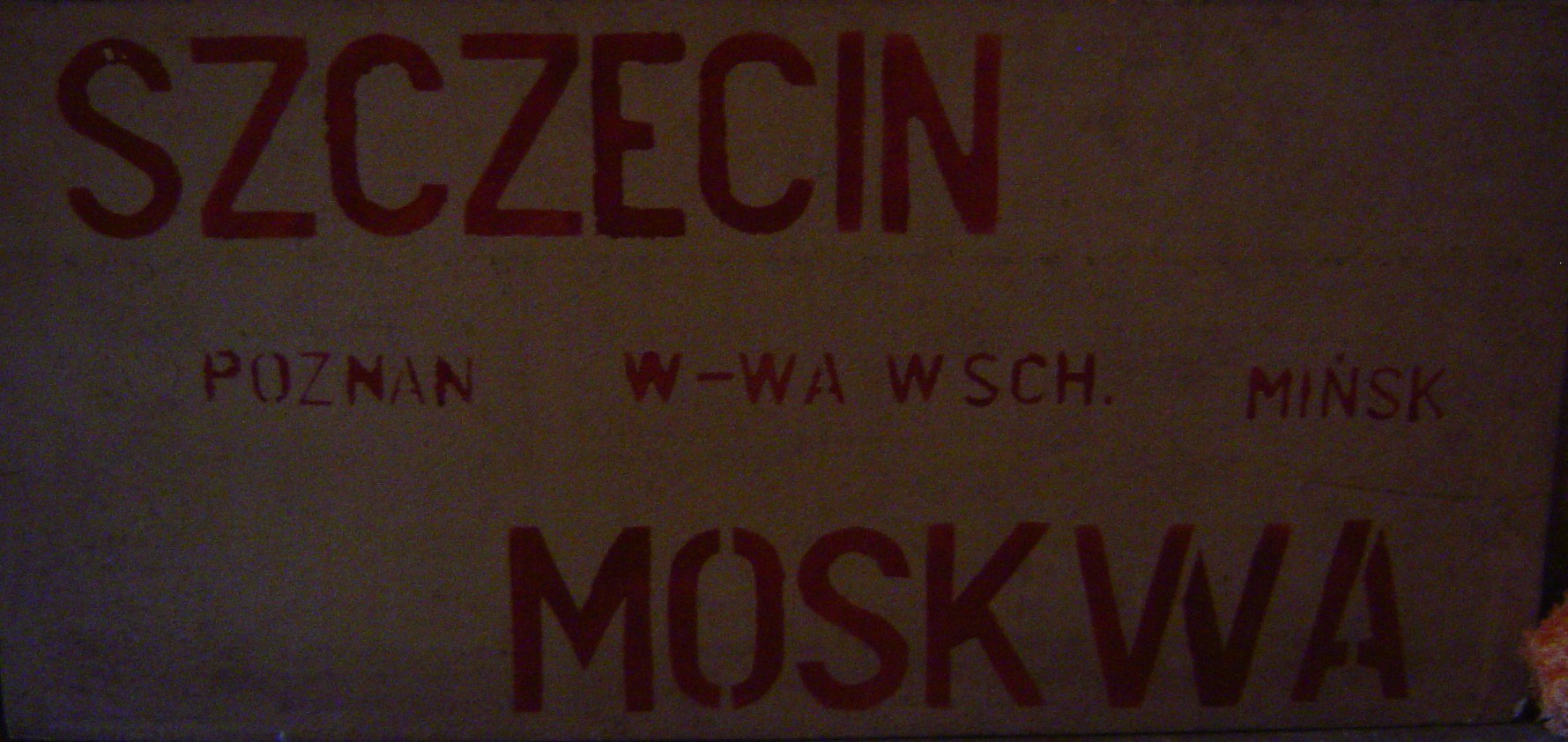 Маршрутная доска в окне прицепного вагона сообщением Щецин - Познань - Варшава - Москва (2004-й год):