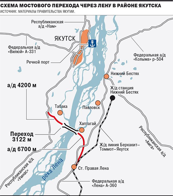 Как выяснил “Ъ”, проект автомобильного мостового перехода через Лену в районе Якутска получил поддержку президента. Владимир Путин, по данным источников “Ъ”, поручил правительству представить предложения, отметив, что «ситуация созрела до реализации». По текущей финансовой модели стоимость трехкилометрового моста с 11 км подходов оценивается в 83 млрд руб. с НДС, предусмотрен капитальный грант в 54 млрд руб. и участие частного инвестора. Легковые автомобили смогут ездить по мосту бесплатно, все остальные транспортные средства должны будут платить 1–4 тыс. руб. в зависимости от категории и года реализации проекта. По мнению аналитиков, не в пример мосту на Сахалин эта стройка нужна. По сути, как и с Сахалином - мост можно заменить фрахтом грузовых вертолетов на 50 лет - по стоимости тоже самое получится. Так что вопрос нужности-необходимости - достаточно спорный.