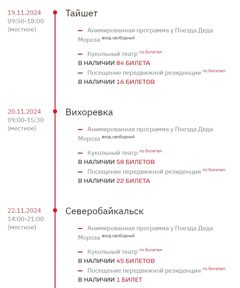 "Напоминаем, что количество билетов ограничено: 15 человек на сеанс в передвижной резиденции Деда Мороза и 26 человек на сеанс в Кукольном театре. Успешная покупка билета зависит от изучения инструкции, скорости ввода ФИО ребёнка и скорости оплаты (если вы привяжете банковскую карту заранее, то шансы сильно повысятся)."