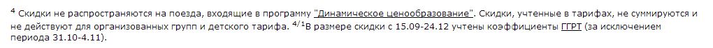 Проверка показала, что при покупке "за 31 день и ранее" тариф на верхнюю полку в купейном вагоне составляет 60% от "нижнего" (за вычетом услуг, разумеется) – независимо от даты и ГГР.balberov: Из релиза следует, что скидка 40 процентов продлится до 24 декабря. Но если бы они учитывали ГГР, то должны были бы сделать оговорку про период ноябрьских праздников, когда изменяется коэффициент регулирования. Так что, может, и учли, но коряво.