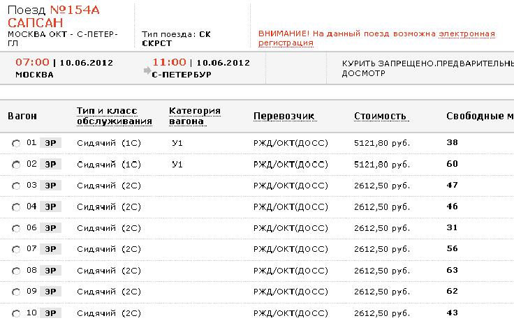 Внимание! На скоростные поезда "Сапсан" отправлением с 1 июля 2012 года стоимость билета формируется с использованием двух критериев: даты поездки и процента занятости мест в поезде. Индексы изменения тарифов - от 0,8 до 1,2.