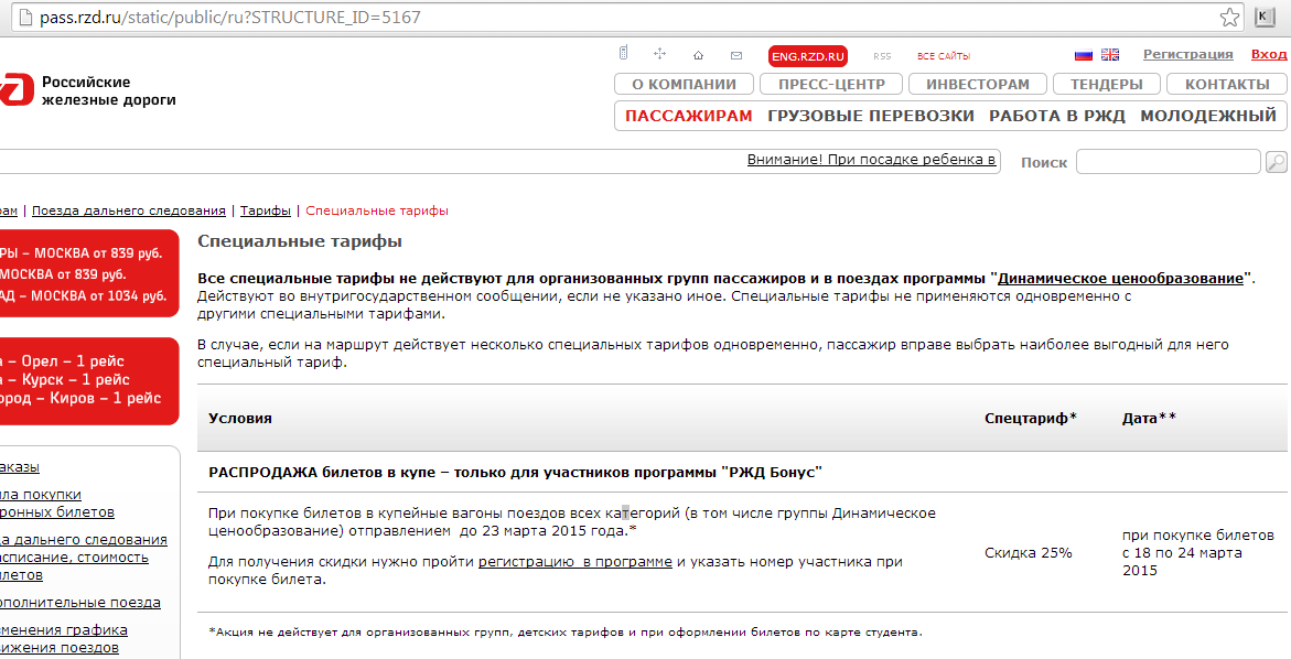 При покупке билетов в купейные вагоны поездов всех категорий (в том числе группы Динамическое ценообразование) отправлением до 23 марта 2015 года.*