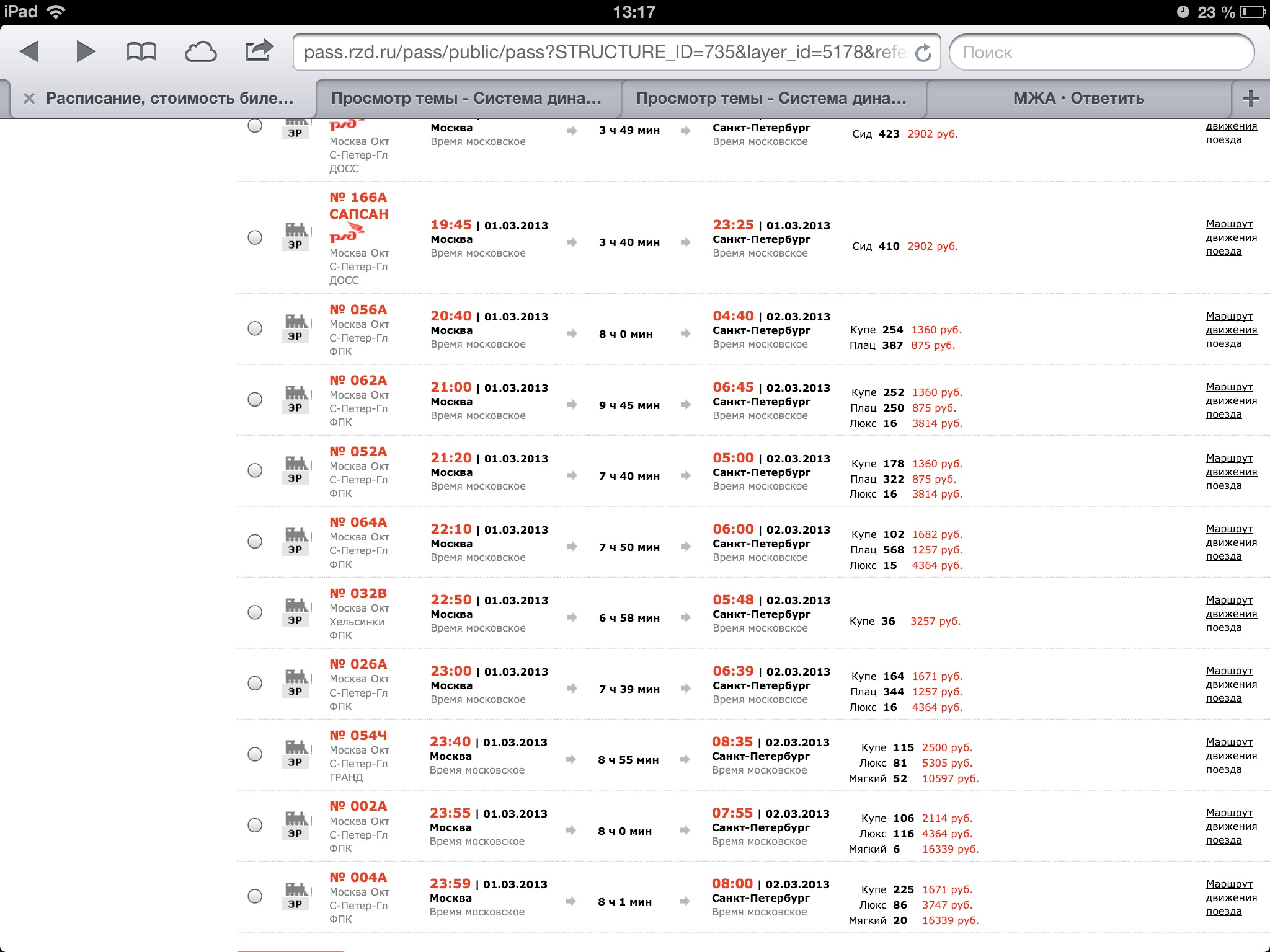 Что то теперь совсем стало непонятно с этой динамической системой. Смотрю билеты на 9 мая в Питер и вот какая картина выплыла. Поезд 220, в котором осталось 1 купейное место стоит дешевле нежели 38 поезд с 12 свободными местами, и эта разница немалая практически в 5.5 раз, или со 102 поездом, в котором свободно 80 с гаком мест и разница в цене почти 2.5 раза. У ФПК конкретно начало сносить башню, или мне это только одному так показалось?