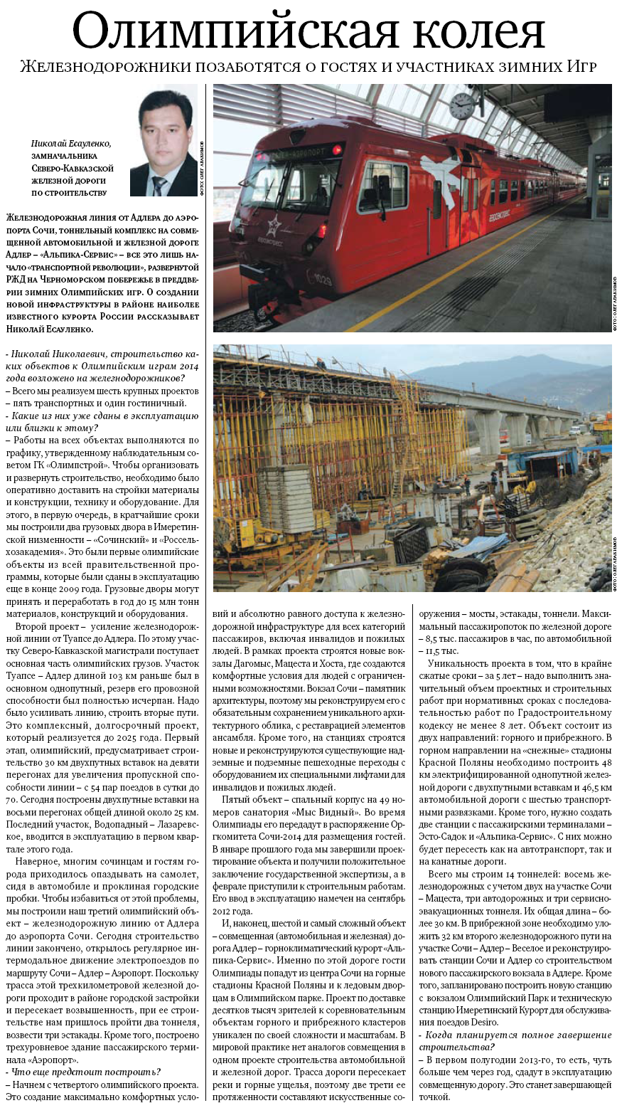 "Современный пригородный поезд "Ласточка" будет обслуживать гостей и участников Олимпиады 2014 года по новой железной дороге Адлер - Красная поляна", - подчеркнул он.
