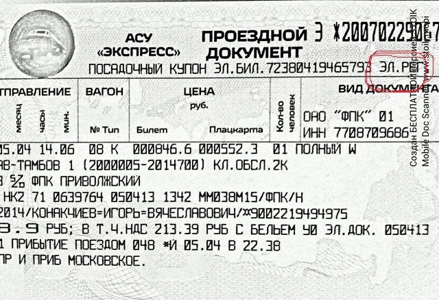 Распечатанный билет с пометкой ЭЛ. РЕГ. (выделено)